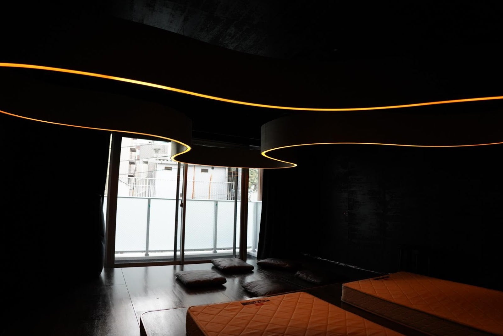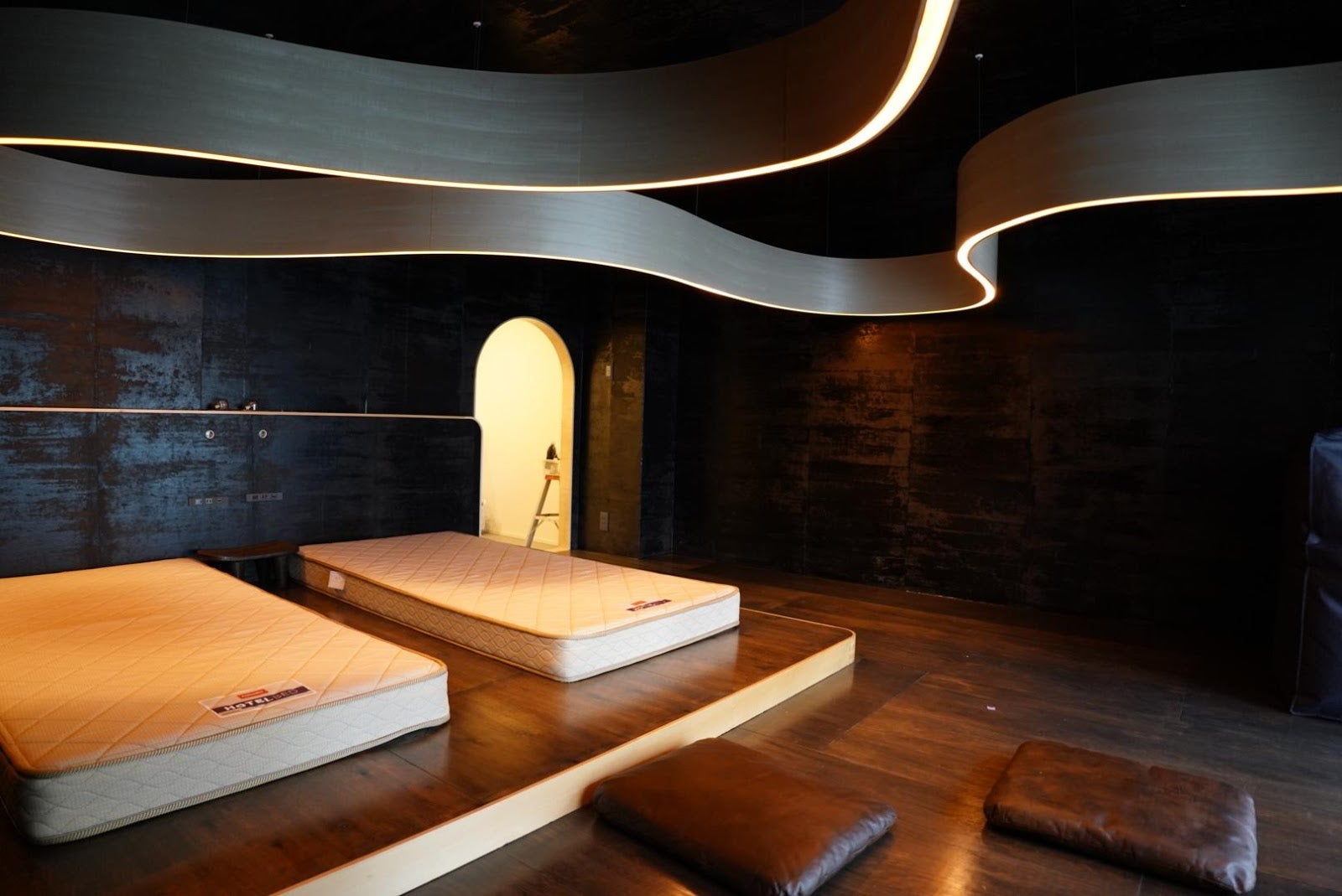 この部屋は茶室の小さくて狭い入り口のように、少し屈みながら入出することになります。曲げ木の照明も目線の高さにあるため、少しかがみながら移動することになります。ベッドや座布団に座ったり、寝転がったりして過ごすことになりますので、普段の生活とは異なり、いつもより目線低いことが特徴です。