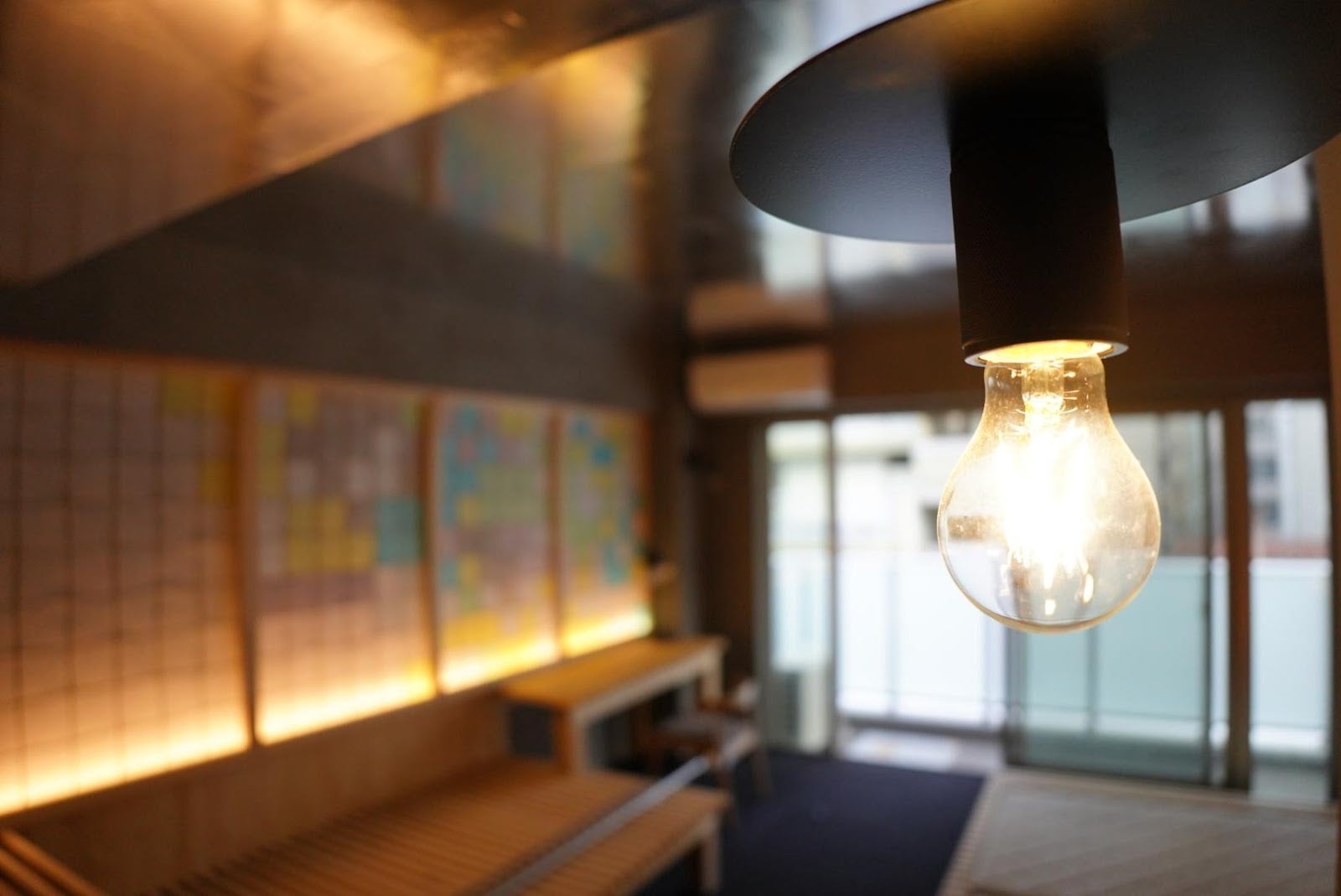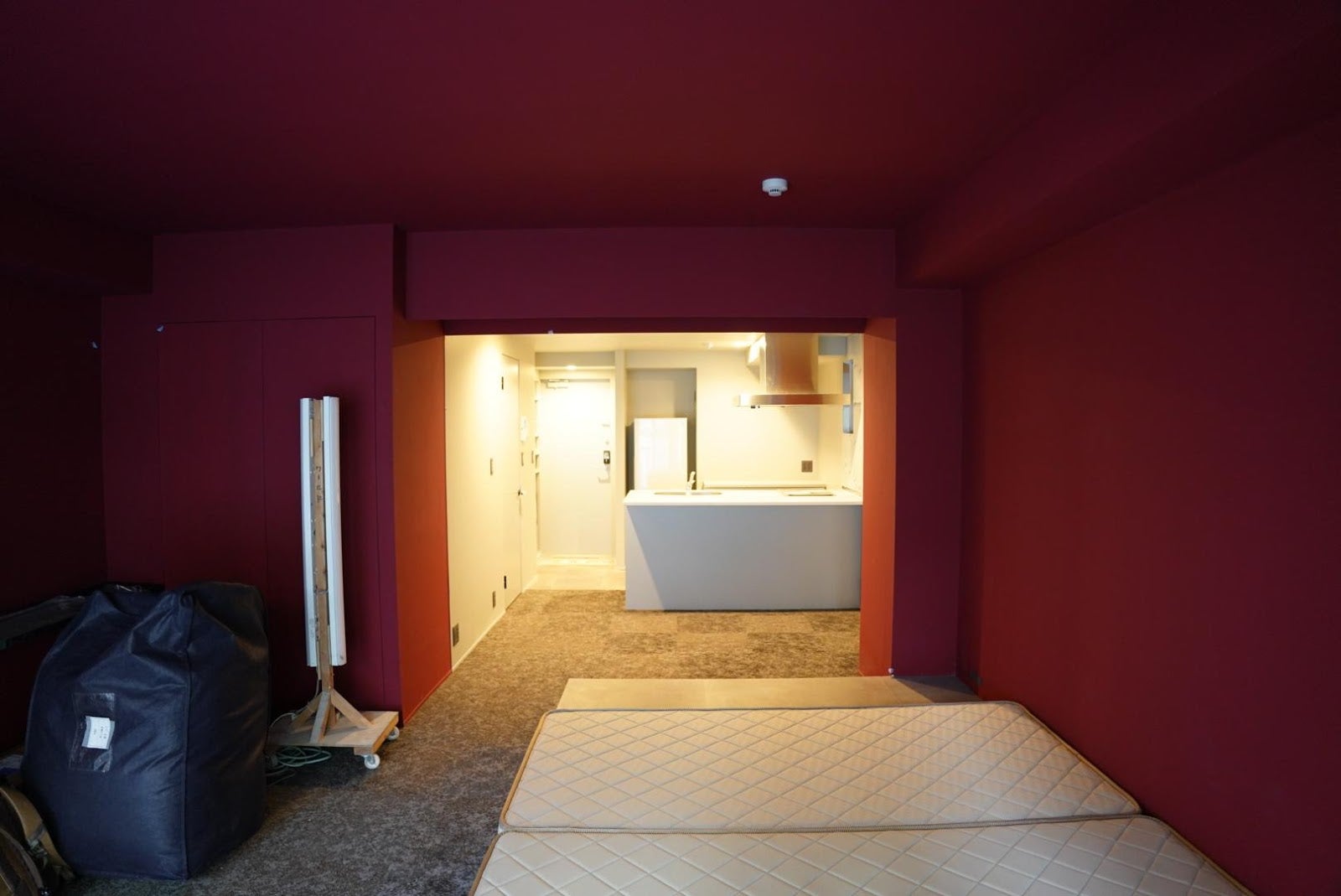 写真は同じ時間に光源を変えて撮影したものです。工事用に仮置してある蛍光灯があると天井や壁面が鮮やかな赤に見えますが、夕方に窓から入る自然光だけだと、落ち着いた黒に近い赤に見えます。