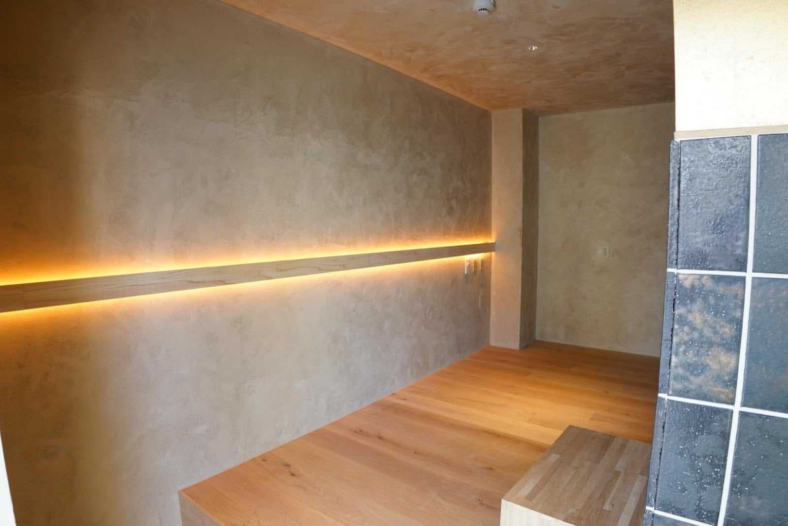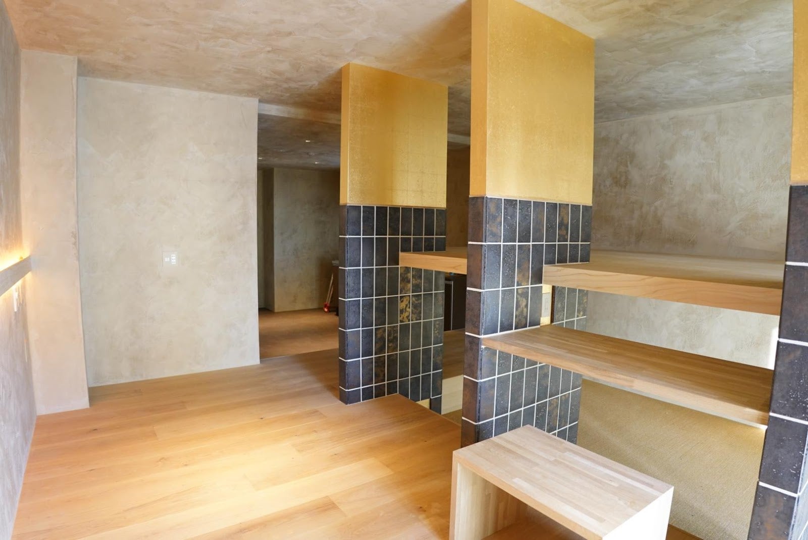 目線の高さが場所によって変わるので、どこにいても新鮮な感覚になります。夕方になると、外の薄暗さと部屋の照明が相まって、室内のさまざまな素材が金色に染まる瞬間があります。部屋壁面の漆喰素材も、金色の印象と相まって本当に贅沢な時間に感じられます。