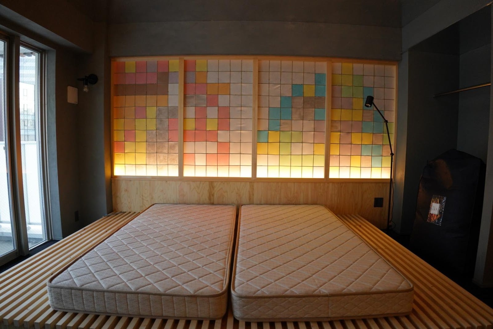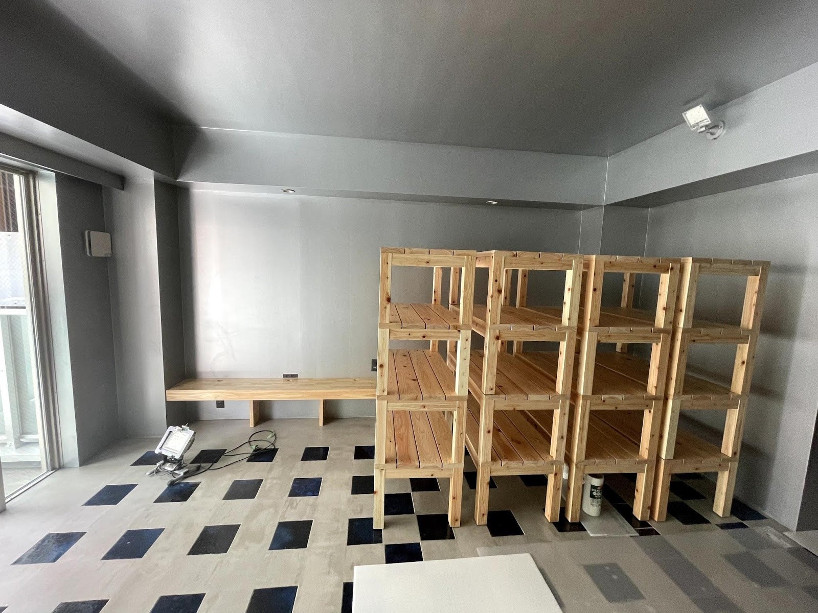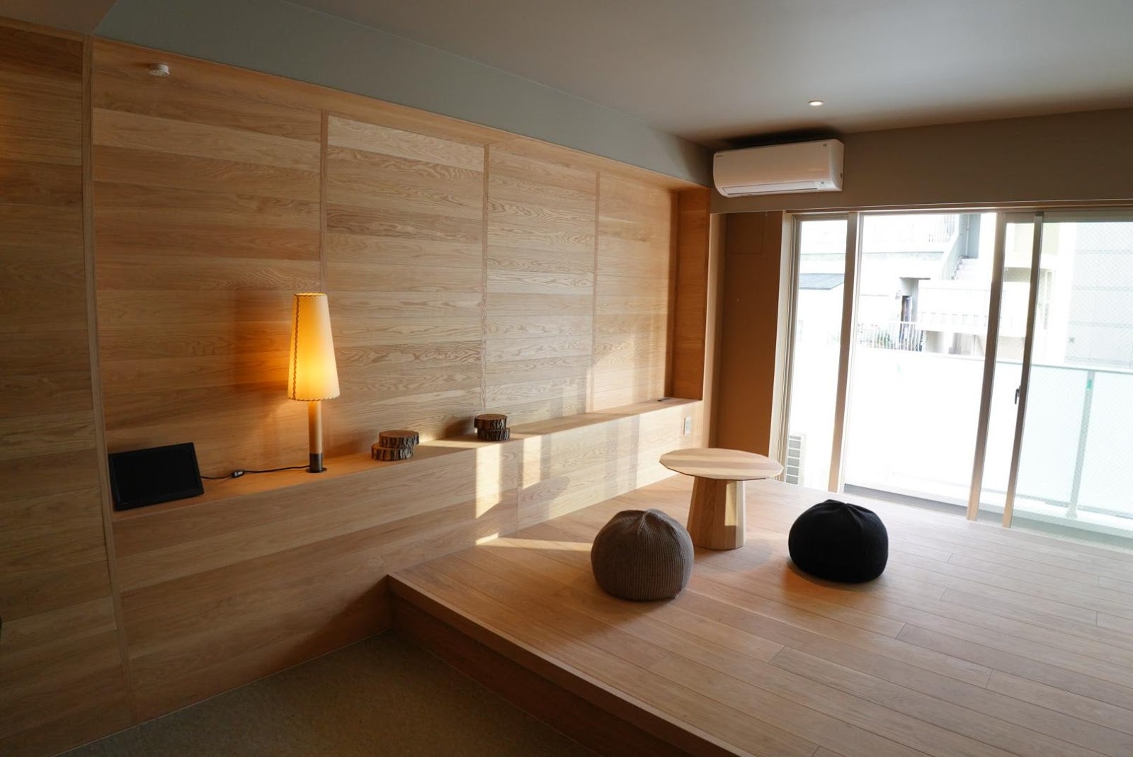 2階はカーテンの設置を残して工事が完了しています。部屋には16台のユニット家具があり、並べるとベッドに、詰めば棚に、1台で使えばベンチやローテーブルにもなります。