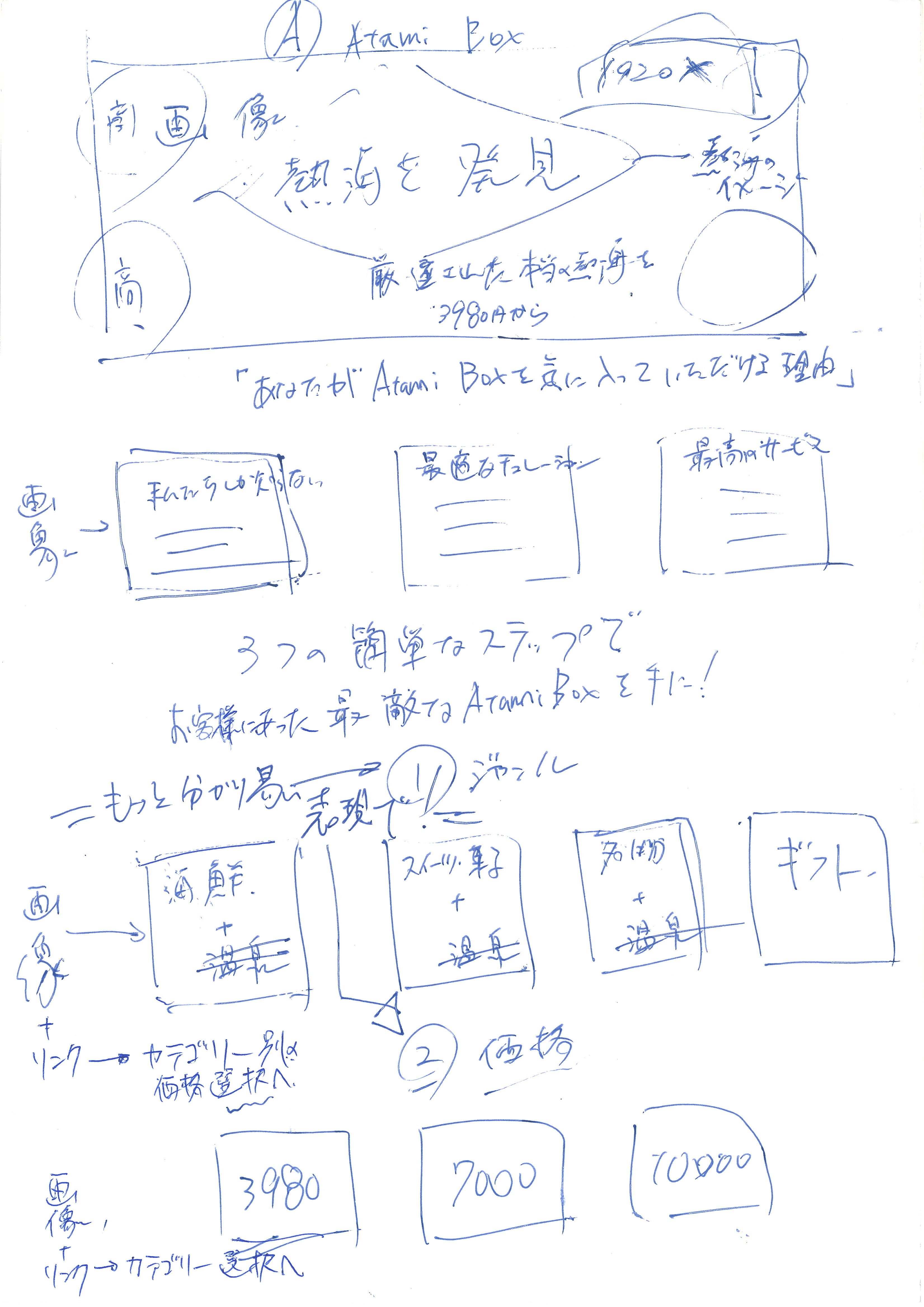 そこで、今日は「Atami Box」本サイトオープンに向けての一番重要になってくるページづくりのラフ画像の一部をお見せします。