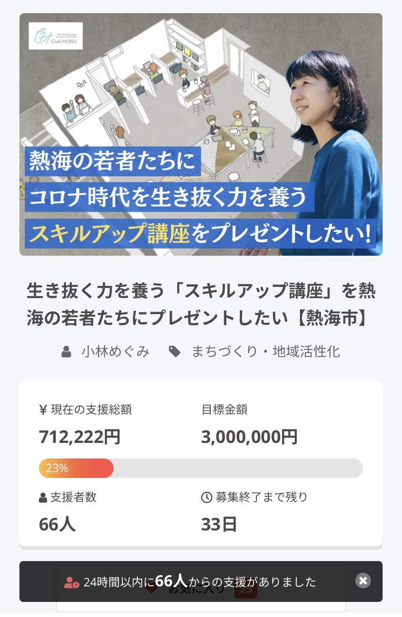 24時間で66人の皆様に712,222円というたくさんのご支援をいただき、