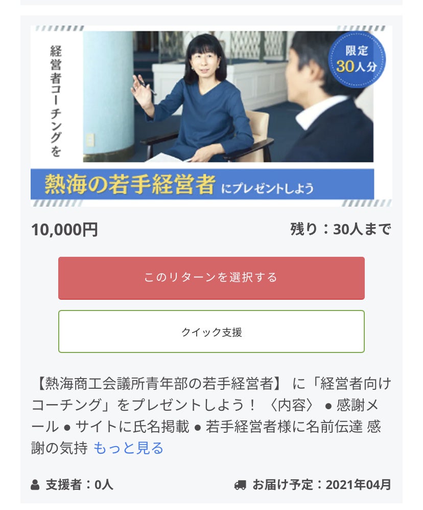 今度は若手社員ではなく「若手経営者」(熱海商工会議所青年部の方メイン)向けに、経営者コーチングをプレゼントする権利を追加しました!