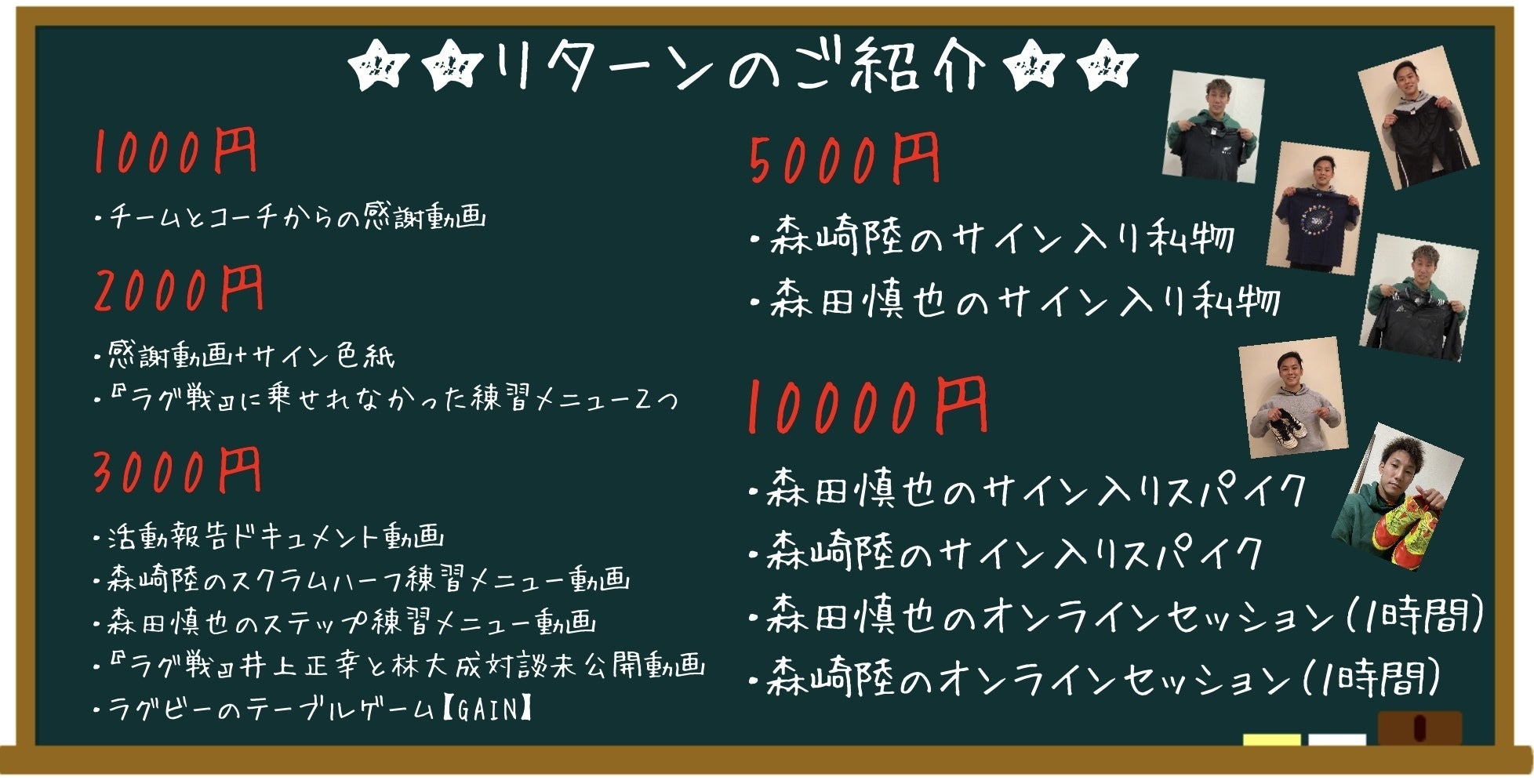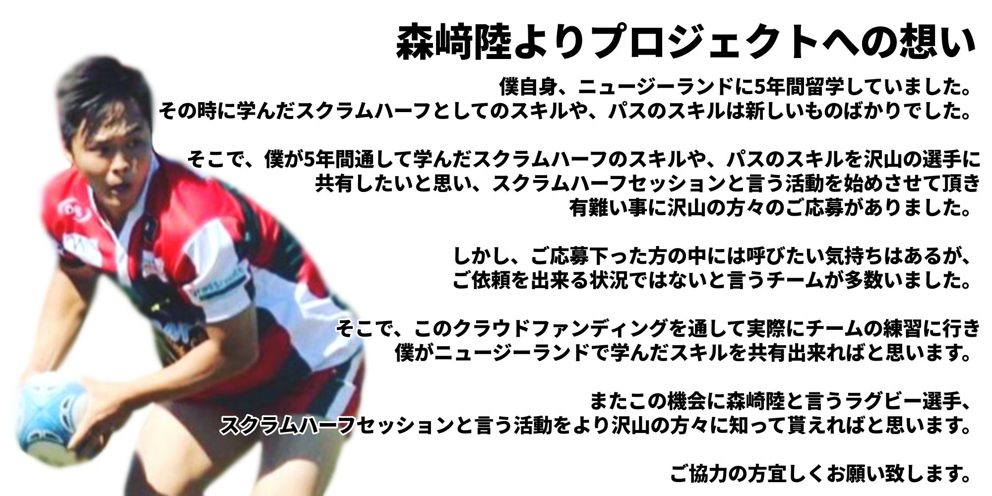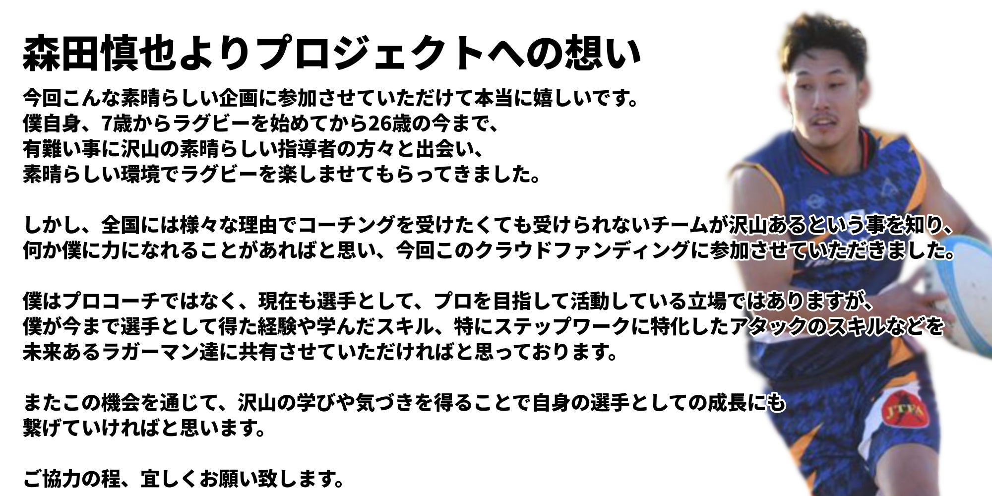 応募して頂いたラグビーチームの元に森田・森崎がそれぞれ出向き2時間のコーチングを行う。コーチ代などの経費は全てクラウドファンディングで集める為、チーム側は0円でコーチングを受ける事が出来る。尚、目標金額に達しなかった場合はプロジェクトを中止とする。