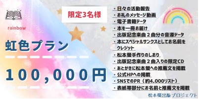 クラウドファンディング開始2日目にして金色プランが限定枠数の上限に達しました!!正直私も驚いています!出版社に報告し「あと3枠ならなんとか、あとがき推薦文の枠を増やせる!」と返答があったので、追加で3名様募集させていただきます!私の記念すべき初出版に、あなたの応援メッセージを載せて一緒に出版デビューしませんか?