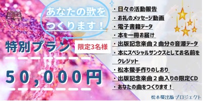 松本螢があなたの歌をつくります。あなたの詞に曲をつける、または曲に詞をつけるというコラボでも、歌のイメージお伝えいただければ作詞作曲両方でもOKです。2021年5月以降打ち合わせ後、10月頃を目安にお届けします。アレンジはピアノのみとさせていただきます。(ほかの楽器をご希望の場合はご相談ください)弾き語りでアレンジした曲をデータ形式でお渡しいたします(WAV or mp3)