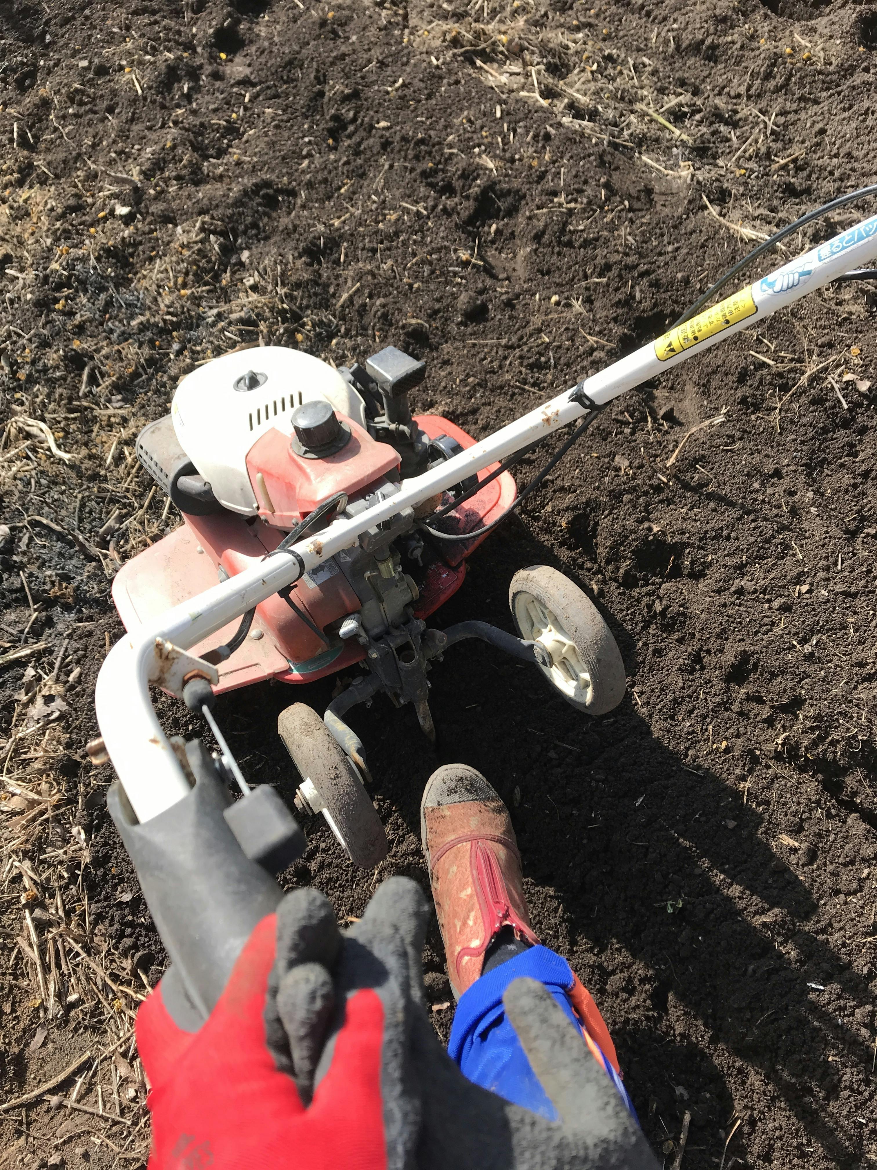 天気がいいので最初に耕したところは乾いてる。そして私は汗だく。