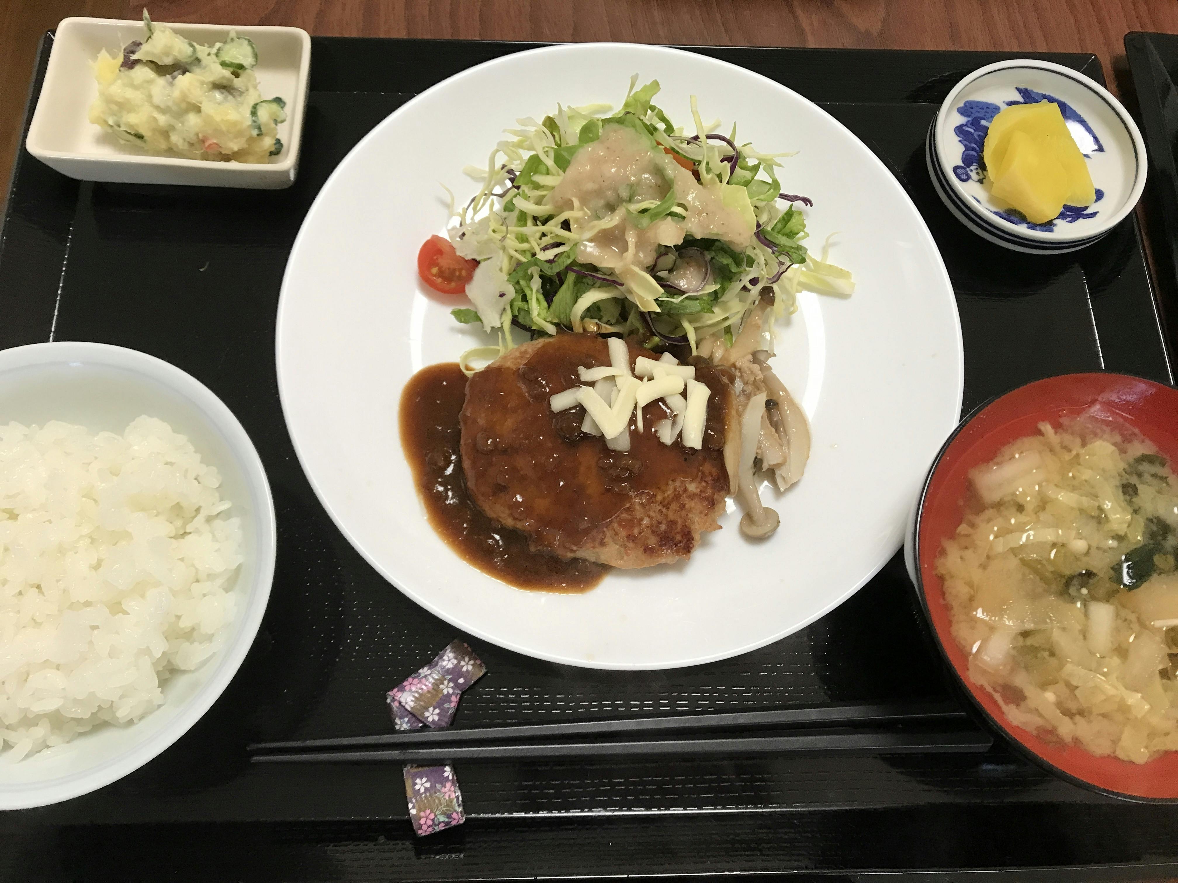 ほぼ週替わりの花笑ランチ、今回はデミグラスソースハンバーグどぇす。