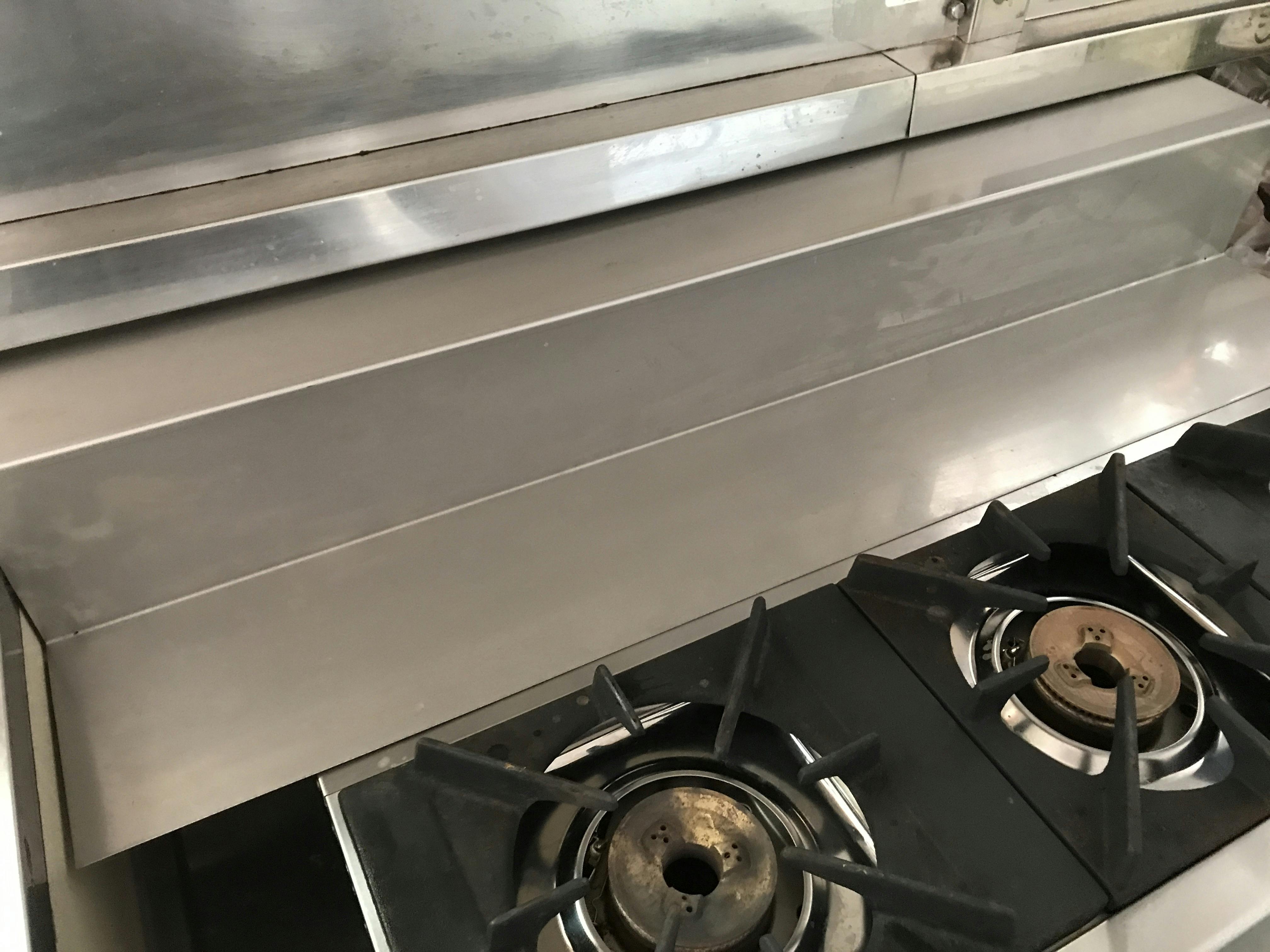 ガスコンロは業務用です。コンロとの段差の掃除が大変になるからと、地元の板金屋さんが家に残っていた材料でカバーを作ってくれました。お陰で飛び散りをサクッと掃除できます。