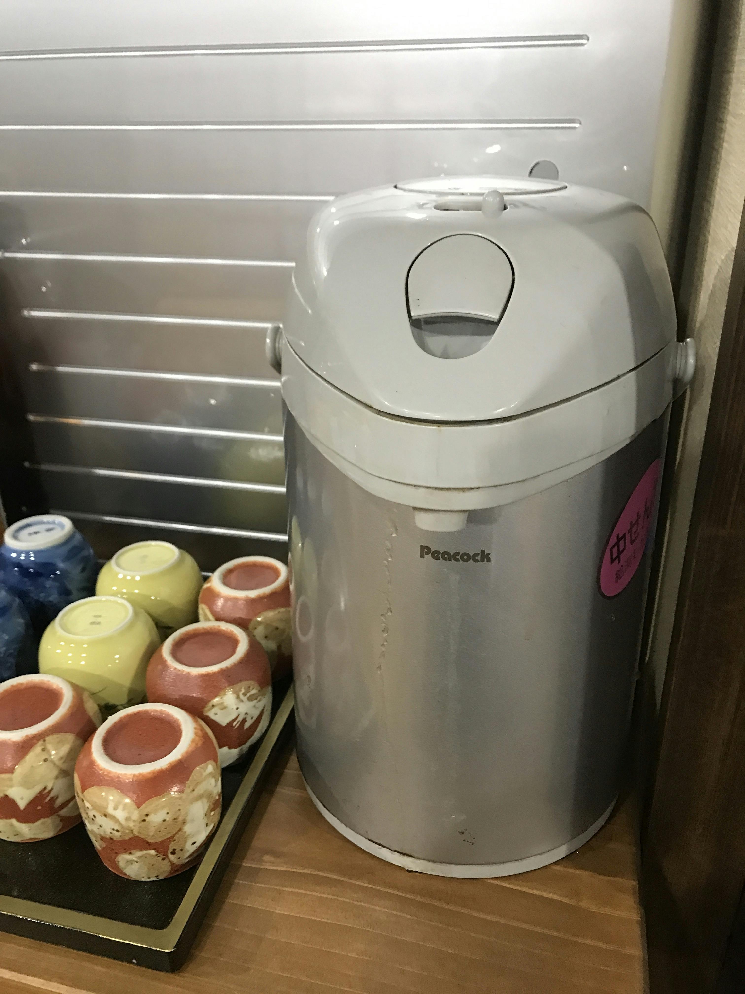 ご来店のお客さまにはセルフでお茶や忙しいときには食器を所定の場所に下げていただくご協力をいただいています。助かります。お茶は朝沸かしてすぐ魔法瓶に入れます。