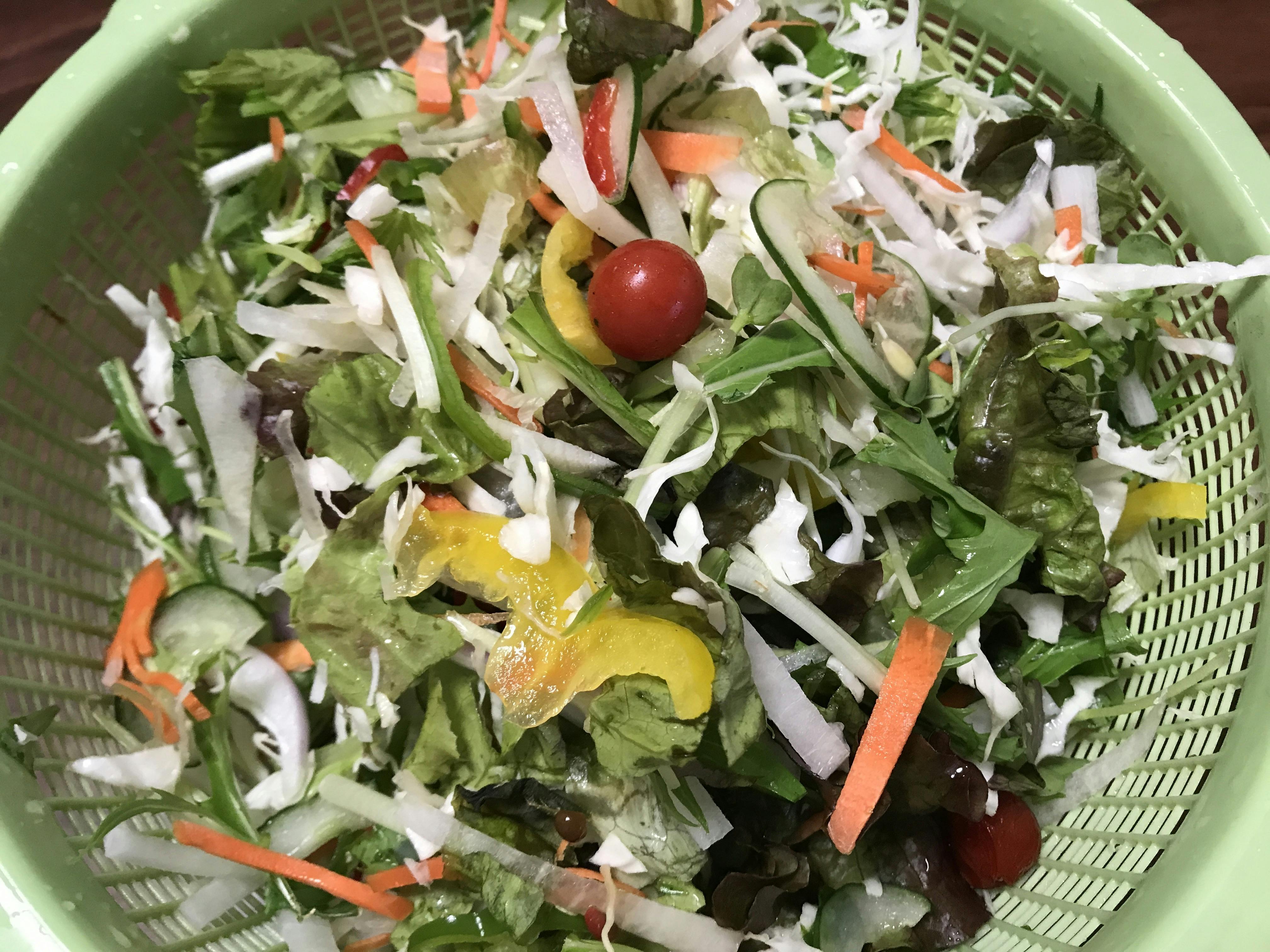 ランチやカレーに付けているサラダ。なるべくうちで収穫した野菜を使っています。ちなみに今日はキャベツ、人参、大根、きゅうり、パプリカ赤黄、ピーマン、プチトマト、赤玉ねぎ、サニーレタス、水菜、インゲン豆、貝割れ大根です。