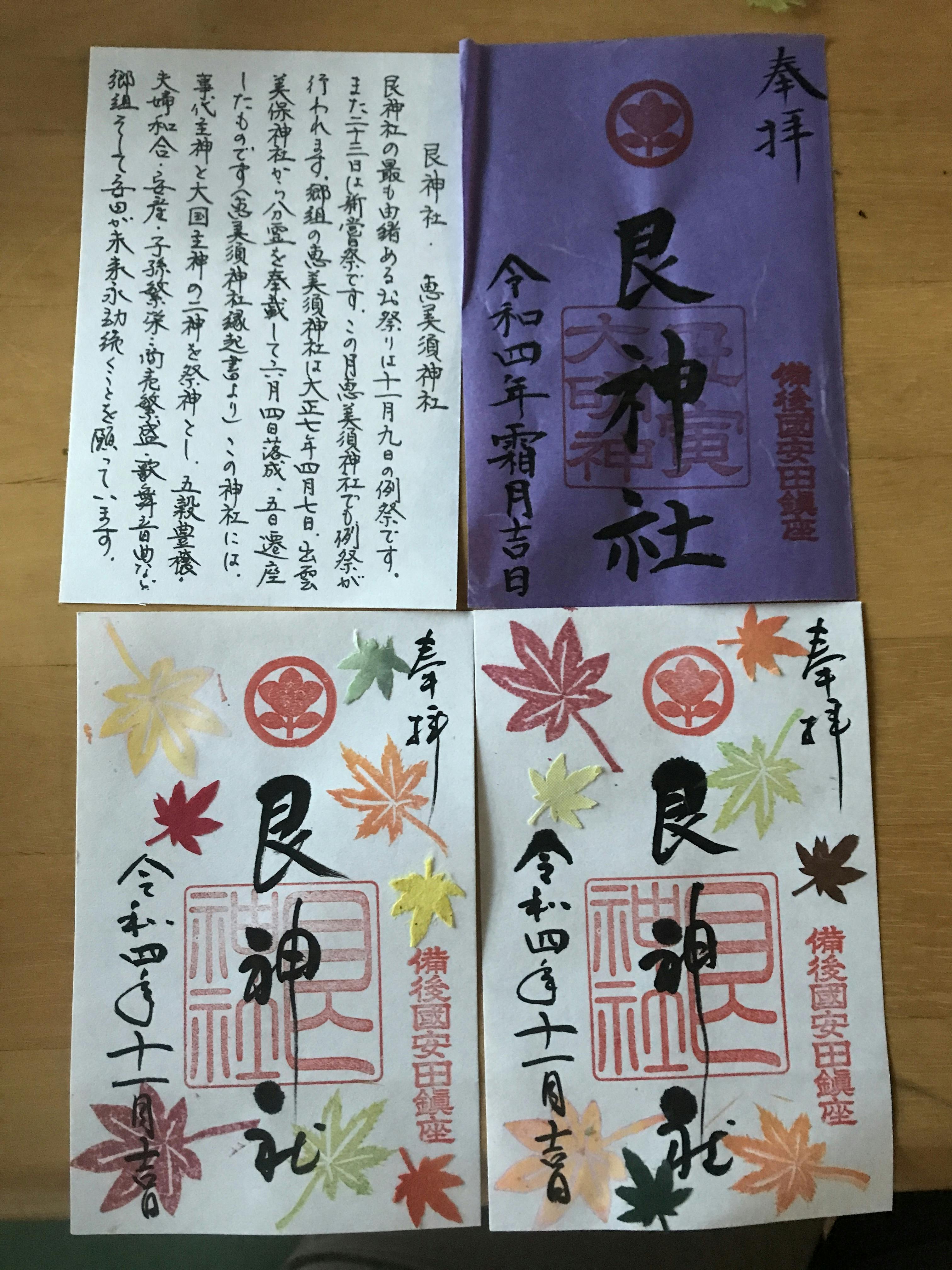今月の御朱印は安田の山も色付いてきた紅葉のイメージとえべっさんのイメージの色紙です。朱印はそれに合わせたものを押してあります。