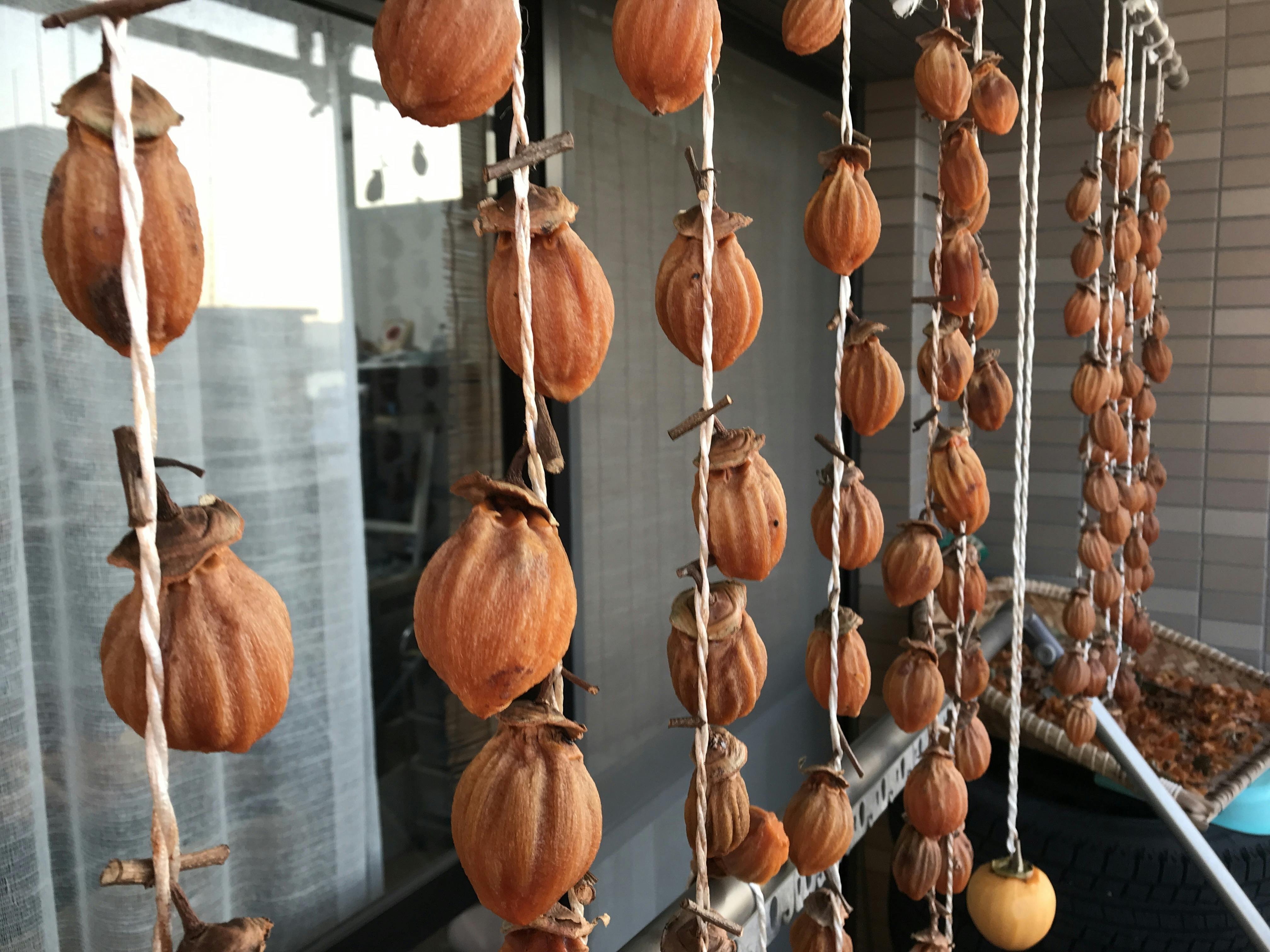 カフェで出し入れしてカビがこないように干している干し柿が徳島では干しっぱでこんなに綺麗に乾いています。取り込んで実家で収穫した渋柿干します。