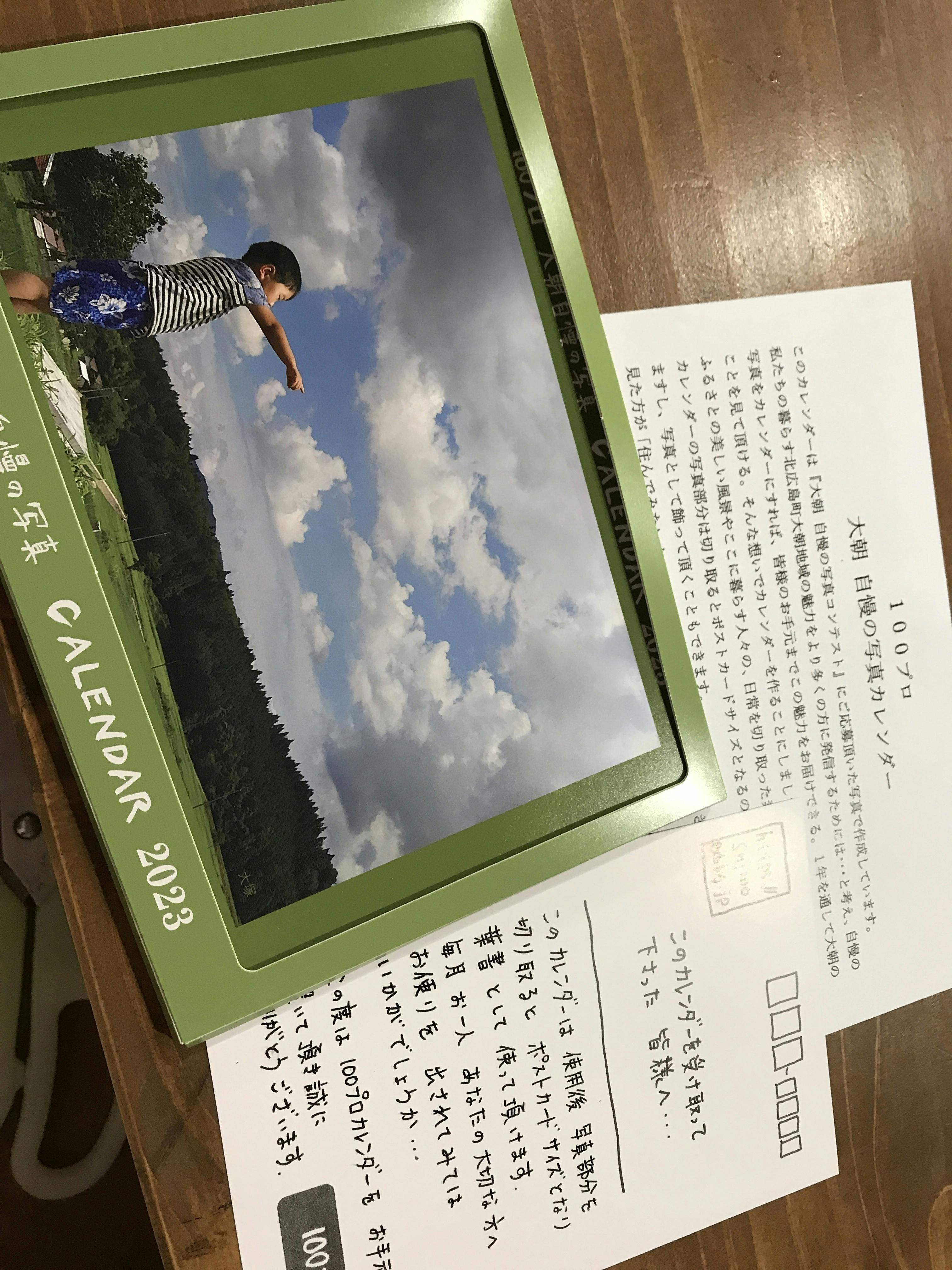 100プロのカレンダー。写真の一枚一枚が笑顔になりました。しかも中の手書きのメッセージや思いが、忘れてはならない温かみを感じました。