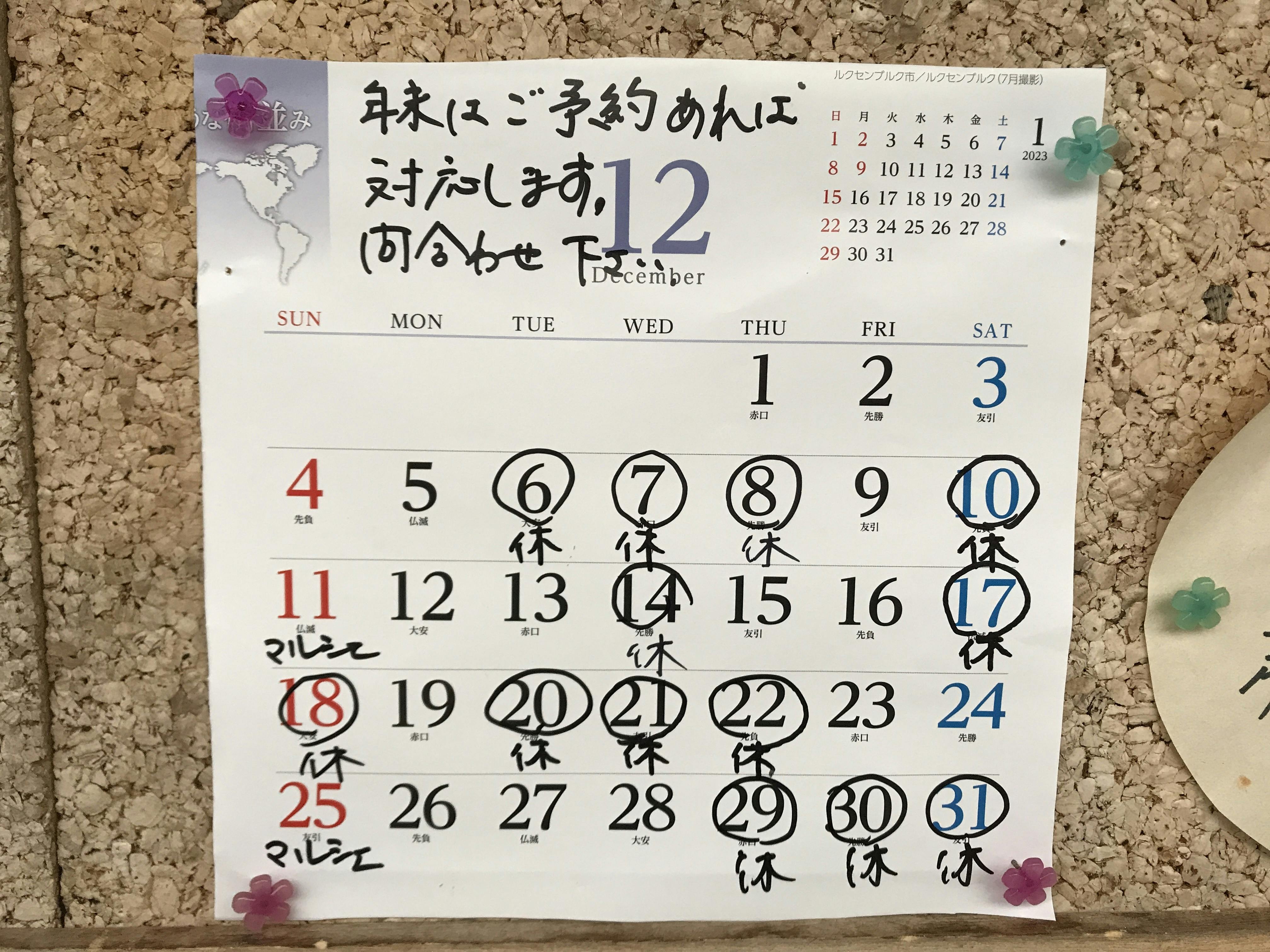 12月です。定休日外に貼りました。イレギュラーで定休日がありますのでよろしくお願いします。黒豆も催促かかってます。口を動かしながら手も動かします。