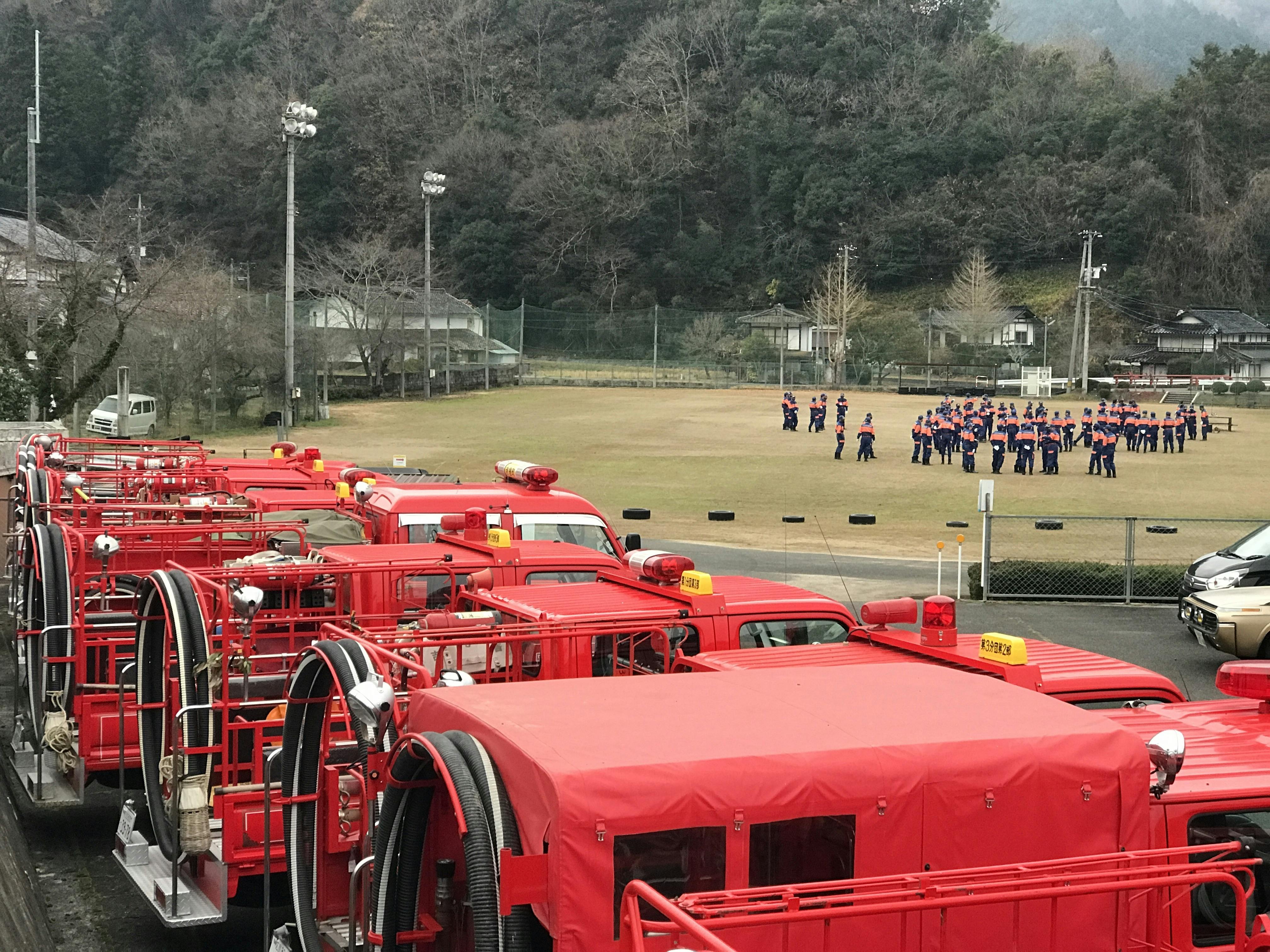 今朝は吉舎の消防団員の皆さんが安田小学校に大集結。車好きの子供さんとか観に来たら喜ぶと思うなぁ。町中を消防車が連なって走りますよ。見かけたら手を振りましょう。