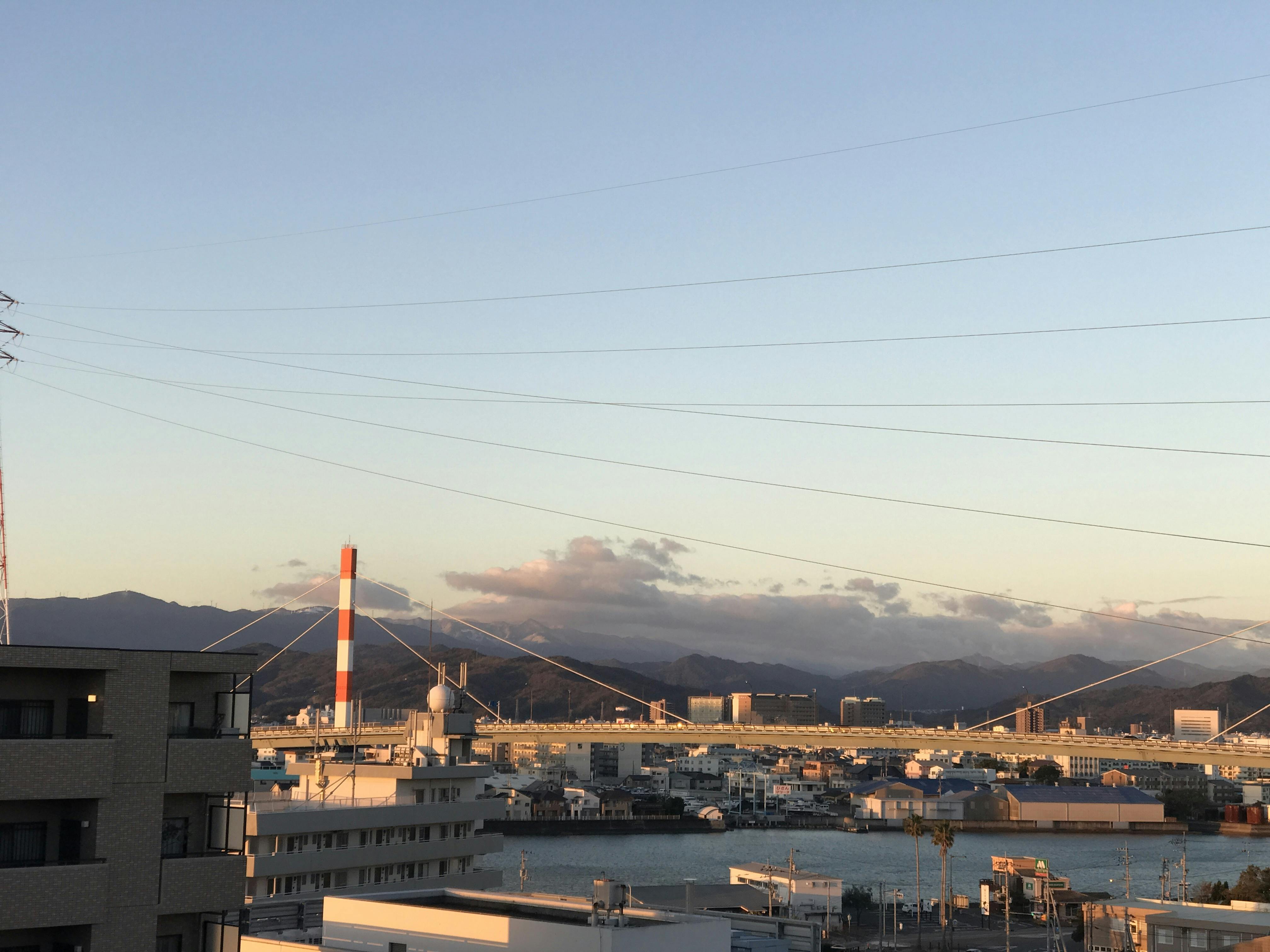 昨夜の移動、途中から路面が濡れ水溜りもありました。今朝の徳島は眩しい太陽が昇り良い天気です。目の前に見える大川原高原の風車周りには雪が見えます。