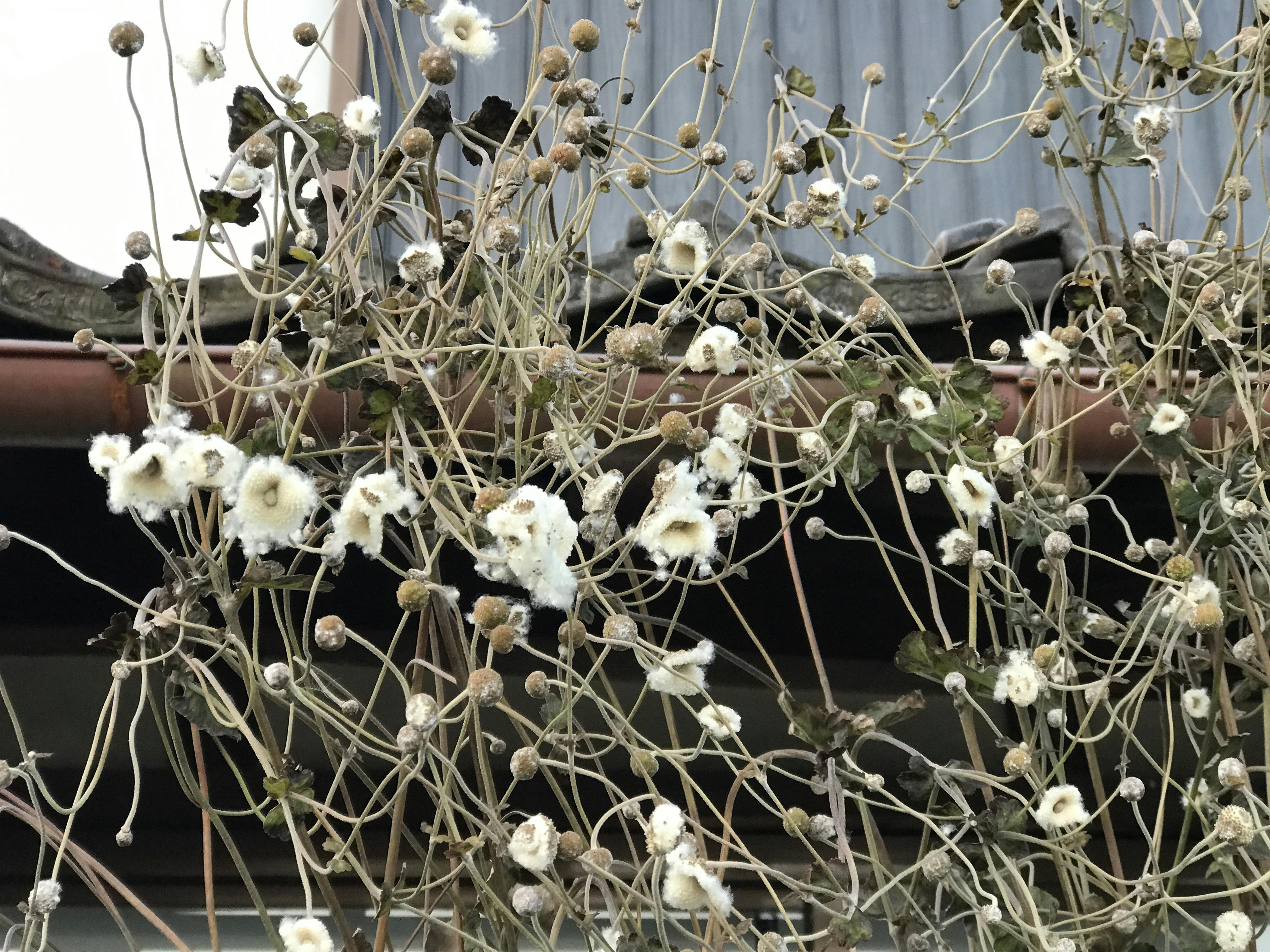 秋、沢山の方に喜んでいただいた秋明菊がこの季節に合わせて変身しています。花が終わったので剪定しようと思っていましたが、もう少しこのままにしておきます。ご来店のお客様に気づいてもらえますように。