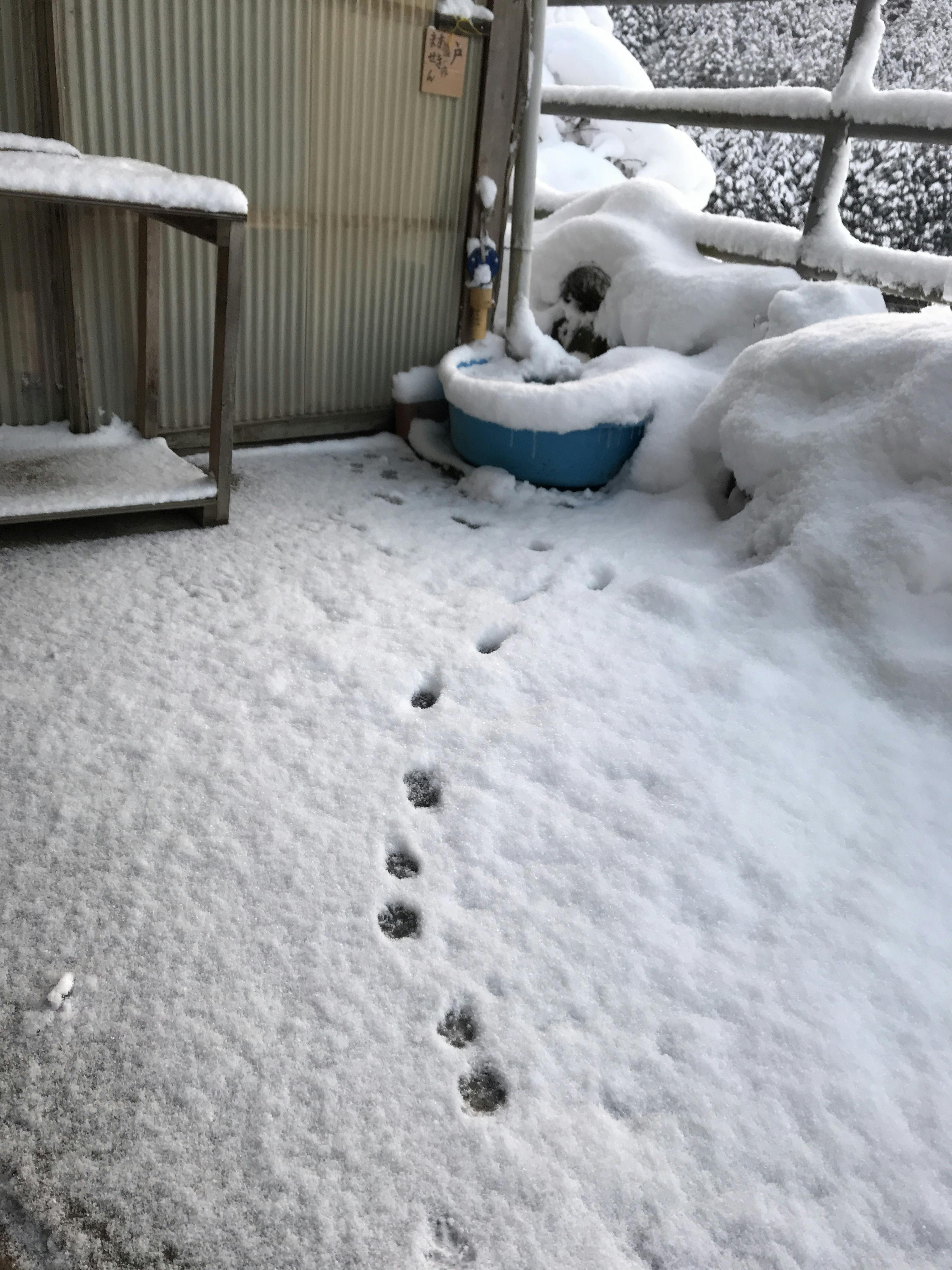 朝の雪かきで外に出たら何かの足跡が付いてます。入口に「開きません」と書いてあるのを見てか諦めて帰ったようです。効果絶大やな。