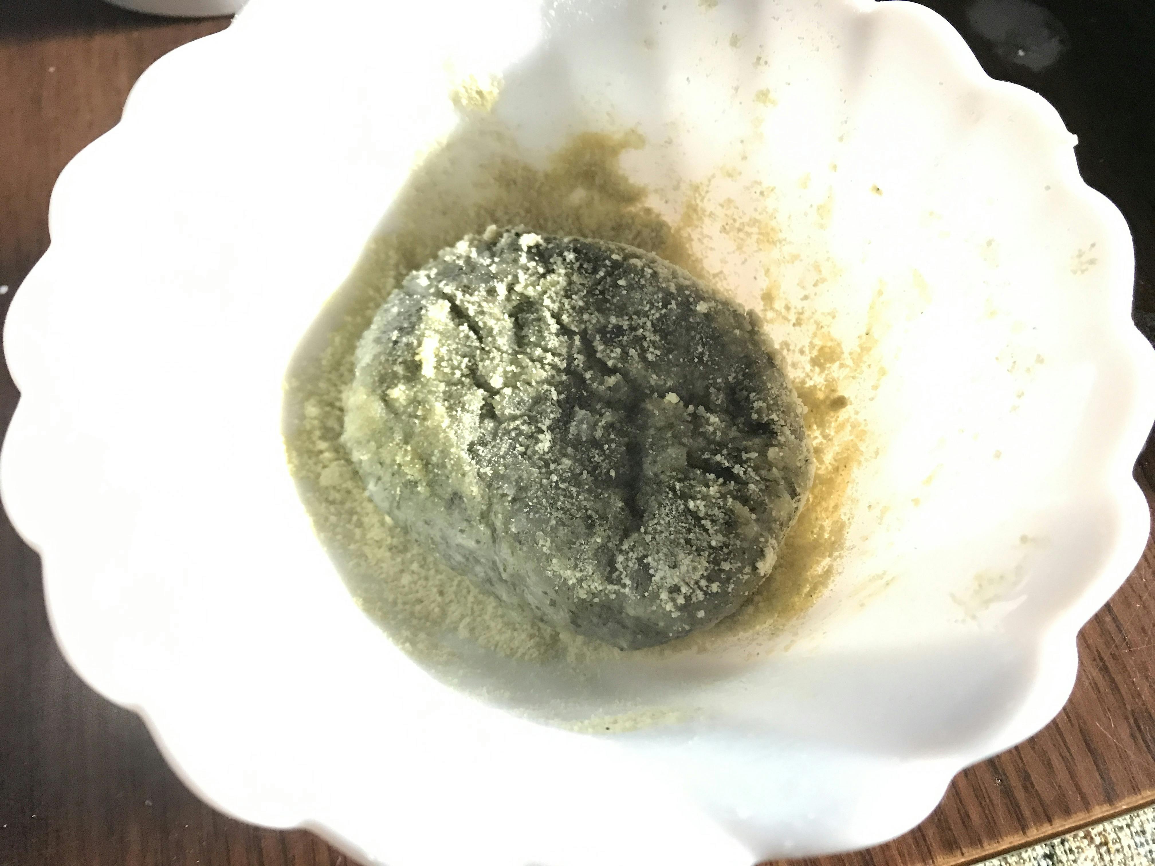 今日からまた生活がスタート。摘んだ蓬で炊いた餅3個を青きな粉で食べます。