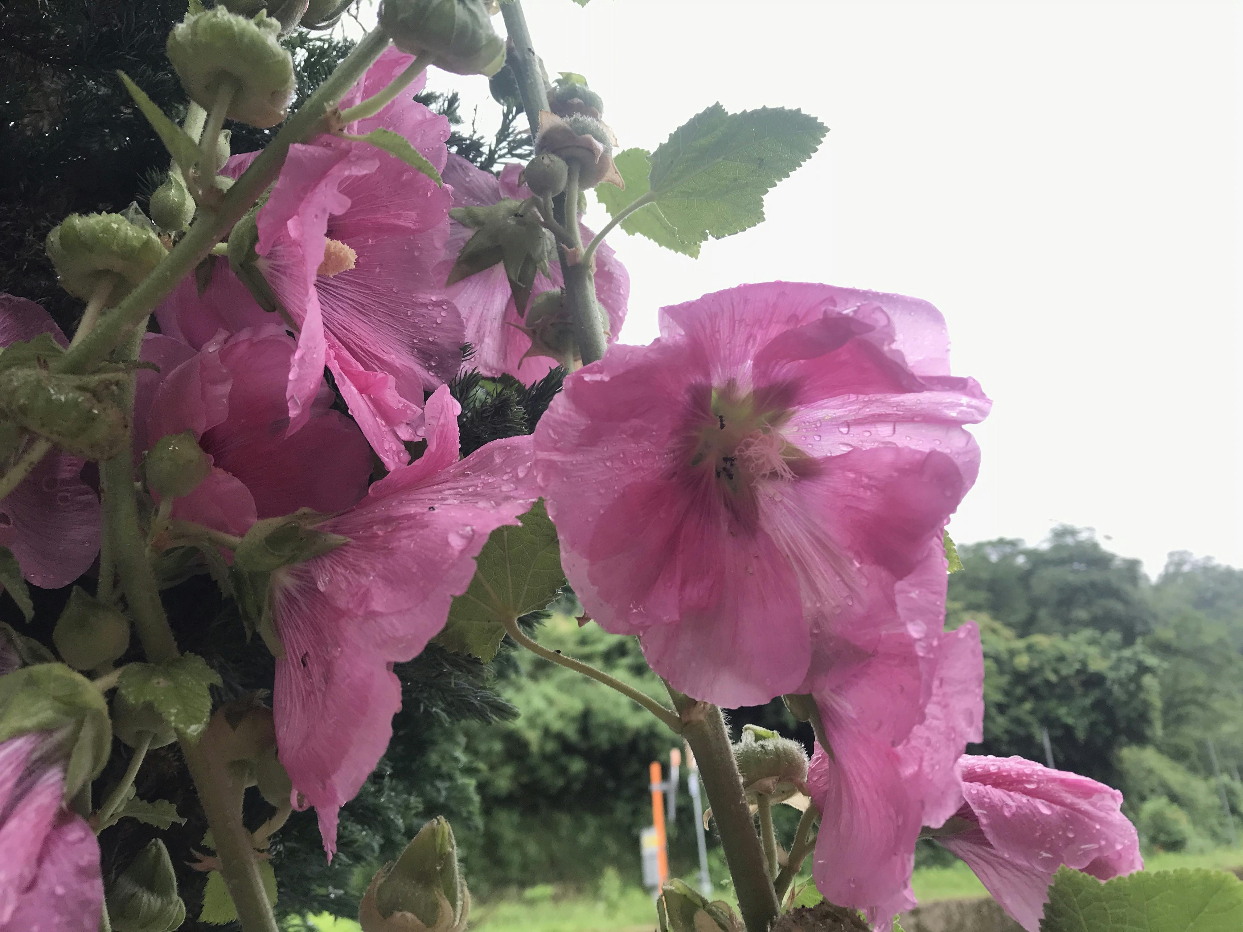 雨の朝です。タチアオイが下を向いています。昨日は遠方から初めてのお客様や夜ミーティングなどありがとうございました♪今日もカフェオープンします♪