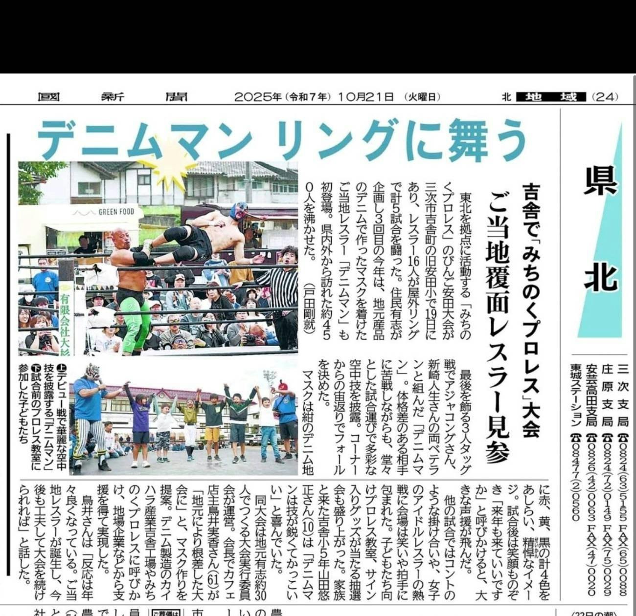 本日の中国新聞にみちのくプロレスびんご安田大会の掲載いただきました。