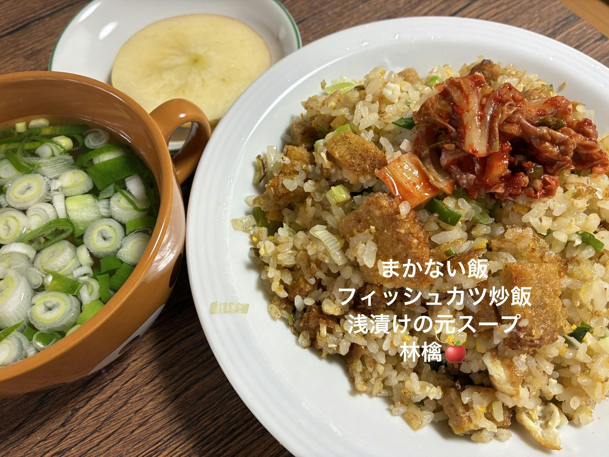 炒飯にフィッシュカツとネギをたっぷり入れてキムチのせ、浅漬けの素をちょっと味噌汁に入れると美味しいよともらった魔法の粉でスープまかない飯
