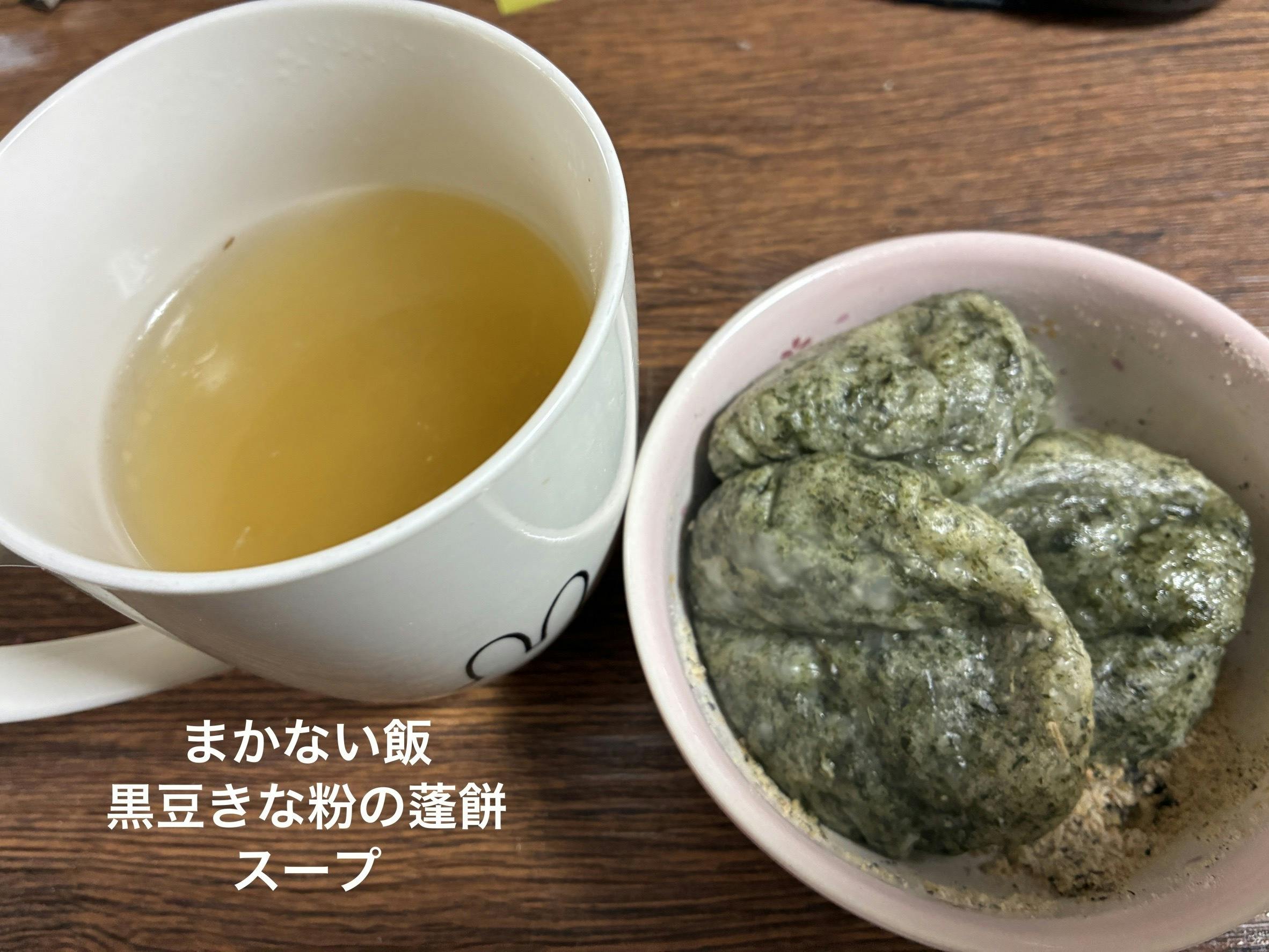 貢物の黒豆きな粉で蓬餅とスープまかない飯