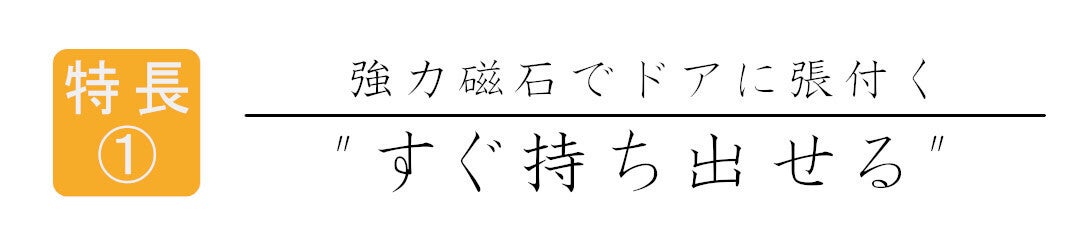 ・スチール製のドアでも一部くっつかない場合があります(スチール製ドアの表面が凸凹である場合、防錆などの特殊表面加工している場合など)。ご購入いただく前に必ずご自宅の玄関ドアを確認ください(磁石を用い、自宅の玄関ドアに張り付くか確認)。