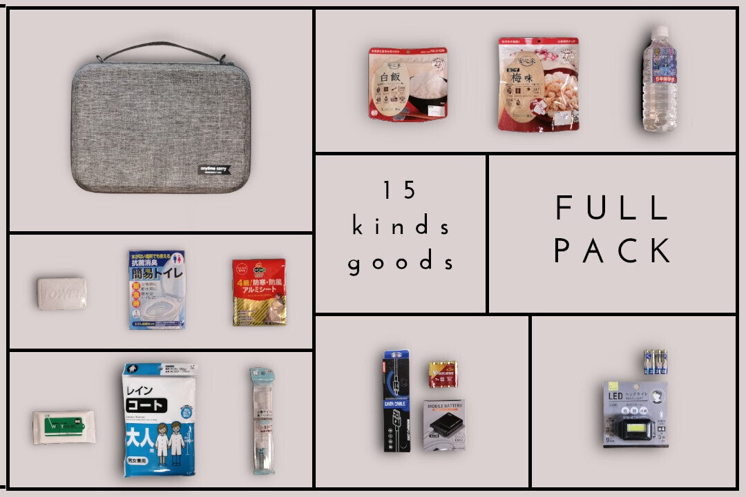 anytime carryが厳選した15種の防災グッツを搭載する「15種フルパック」。