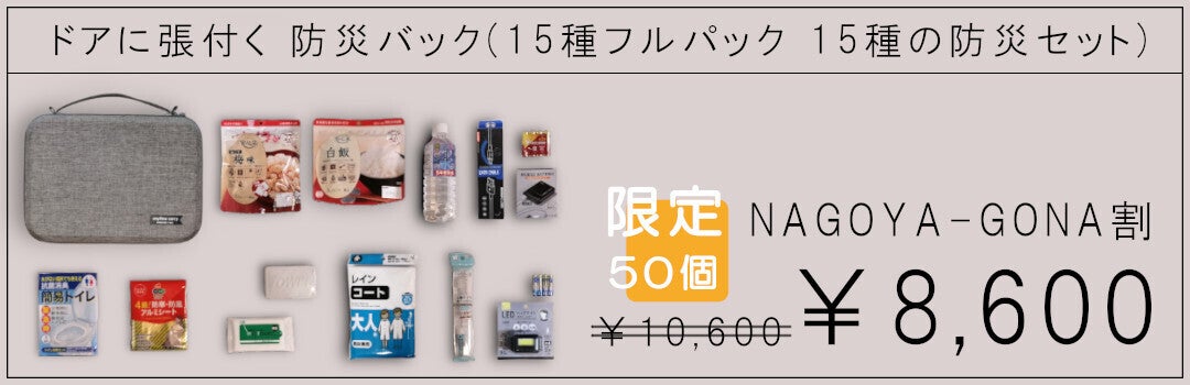 「ドアに張付く 防災バック」の【単品】、9種の防災グッツセットの【9種パック 】、15種の防災グッツセットの【15種フルパック】の3種類用意いたしました。