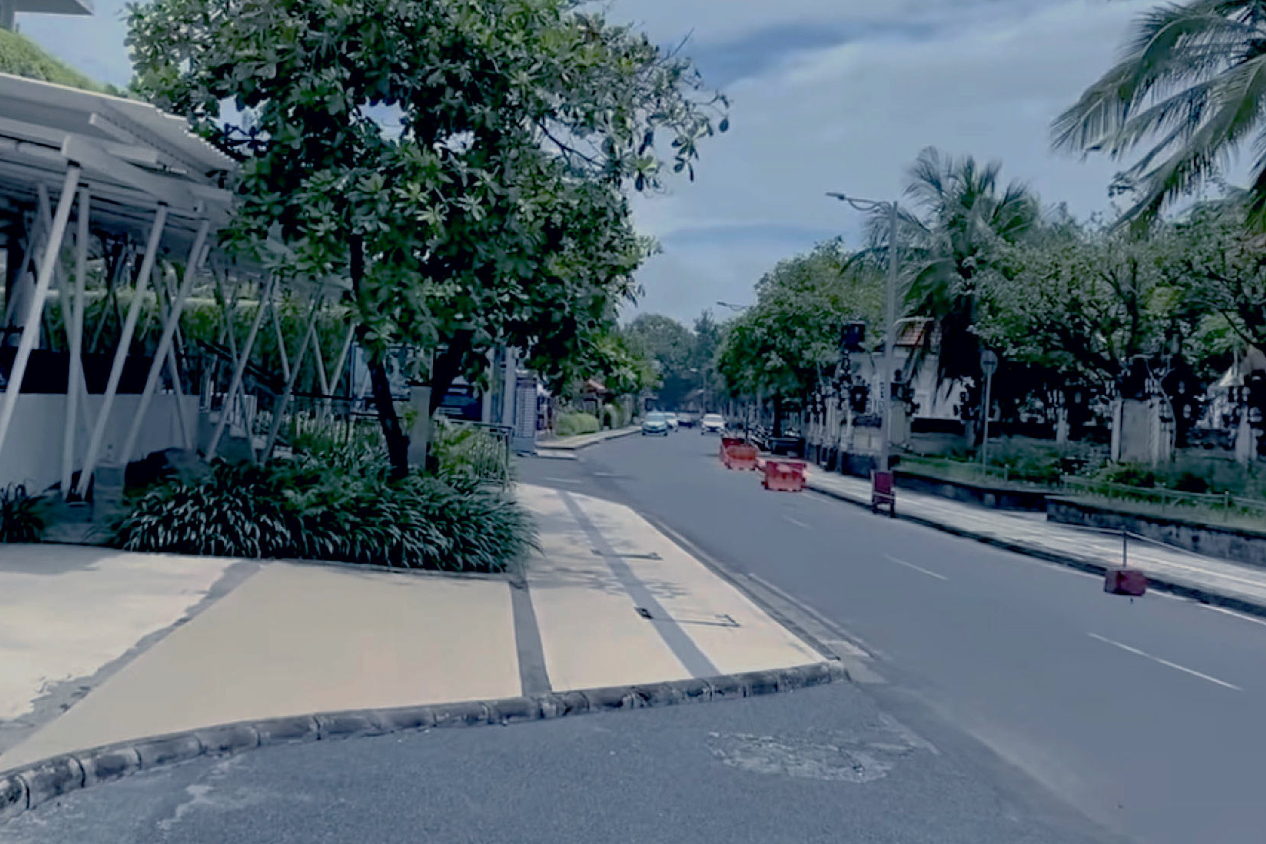 路肩に数百台のバイクがズラッと駐車しているはずのクタビーチ(右)とビーチウォーク(左)