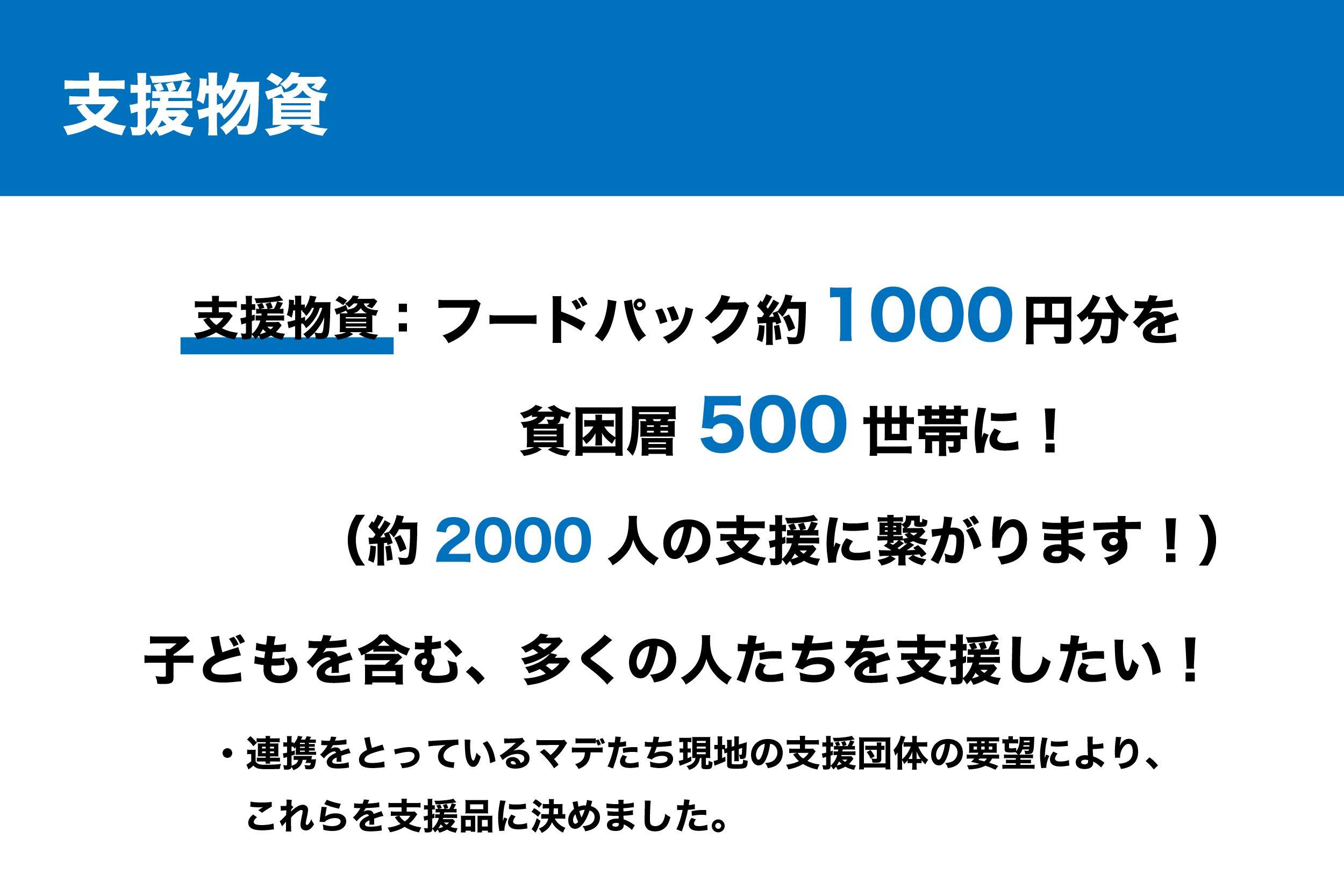 ※バリ島は、1世帯あたりの居住人数が約4人500世帯 × 4人= 約2000人支援できる計算