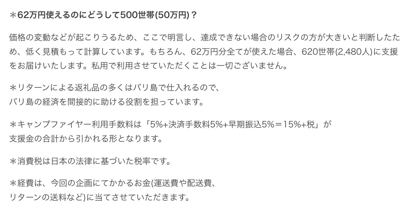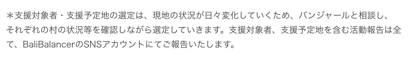 2021/09/25 20:00皆さま、お世話になっております!Bali Balancerのコウキ、イツキ、ジンです!活動報告が更新できておらず、まだかまだかと心配をおかけしてしまい大変申し訳ございませんでした。今回のご報告としましては、バリ島にて、無事支援活動を終えられたことをこの場を持ってご報告いたします!支援活動がどのように行われ、実際にどのような効果を生み出せたのかをみなさんにお伝えできればと思います。その前に、これまでの活動の経緯を簡単にご説明いたします。 【本活動のこれまでの経緯】2月1日 クラファン案発足3月20日 クラファンスタート4月17日 クラファン終了6月19日:インドネシアのジャカルタへ6月19日~24日:ジャカルタでの隔離6月24日:バリ島へ到着6月24日~7月1日 自主隔離・場所選定7月2日~15日 支援活動・リターンの仕入れ等7月15日 学業のためジンのみ帰国8月14日 コウキ、イツキ帰国8月14日~28日 ホテル隔離・自主隔離といったスケジュールで動いておりました。バリ島では、日本でいう緊急事態宣言のようなものが出ており、行動を制限されてはいたものの、コウキの叔父さんを含む、バンジャールの皆さんのおかげもあり、支援活動を遂行することができました。【支援した地域の数などの詳細】ここで1つ、皆様に謝らなければならないことがあります。元々、本クラファンにて支援金を集めていた際に、支援金は、1世帯あたり1,000円分の支援物資を、支援が行き渡っていない身体の不自由な方やお年寄り、身寄りのない子供達などに配るとお伝えしておりました。ですが、それは実際に現地を見ていない状態の独断と偏見で決めていました。そのため、いざ、実際に現地で支援対象者の方達の生活を拝見した時に、1000円分では到底足りない人たちであることを知りました。そのため、1世態あたり1000円分から2500円分に引き揚げさせていただきました。みなさんにご支援いただいたにも関わらず、勝手に予定を変更してしまい、大変申し訳ございません。もちろん、私用で利用したわけではなく、支援総額に関しては変わりはありません。【支援地域と支援物資の量】1世帯 / 2500円分米:10kg卵:30個油:2Lインスタント麺:10個支援地区数 / 4地区クシマン:80個カランアサム:100個ギアニャール:70個ブレレン:70個合計320世帯合計80万円その他、本活動で利用させていただいた金額の内訳をまとめているので、こちらからご覧ください。支援金の内訳https://docs.google.com/spreadsheets/d/1yip_s2j-13rCUTkJhZv8blFE06jaeqS6lJjoYil67t0/edit?usp=sharing 【支援活動の様子】 朝の6時から移動を開始し、昼の時間に支援活動をし、時には山に登り、時にはあたりが暗くなるまでかかることもあった支援活動でした。そこでは多くの方との出会いがありました。目が見えないのに、窓がない真っ暗な部屋で体の至る所を火傷しながら料理をして暮らすおばあちゃんや、ビニールシートで作った家で暮らし、病気で仕事ができず、年中芋だけを食べて過ごすおじいちゃん、両親を亡くし、おばあちゃんに引き取られた子供たちなど、やはり僕たちのこれまでの生活とはかけ離れているものでした。ですが、そこでの皆さんの笑顔は忘れることができません。僕たちの生き方や価値観がガラッと変わった経験でした。【本クラファンを通じてバリ島がどうなったのか】本クラファンの根幹であった、バリ島に笑顔を取り戻すという目的を達成することができました。というのも、本クラファンを通じて、支援物資だけでなく、多くの笑顔と愛を届けることができたからです。とはいえ、僕たちは支援を行う前、非常に不安な気持ちでした。本当に喜んでくれるのだろうか?嫌な目で見られるのではないか?そんな不安を3人それぞれが抱えながらの支援活動スタートでした。ですが、そんな不安も、1人目に支援物資を届けた時、一瞬で吹き飛びました。全ての方が、笑顔で、僕たちを歓迎してくれました。そして、『クラファンにご参加くださった皆さまからの支援物資です!』ということを伝えると、こちらが申し訳なくなるほど、感謝してくださいました。実際にバリ島で支援活動を行う中で、約1000人近くの人たちと触れ合い、その全ての方が笑顔で僕たちと接してくれました。逆に、僕たちが救われる思いでした。ちなみに、どれだけバリ島へ支援として還元できたのか、数値でお伝えしますと、80万円分の支援物資、支援活動にて利用した経費、リターン各種、を含め、123万8,304円をバリ島に住むみなさんへ還元することができました。また、今回のバリ島への渡航に関してかかった金額や、滞在費、食費なども含めると、約200万円ほどをバリ島に還元できました。【総括】無名の、ただの学生の活動に、ここまでご賛同いただけたことは、本当にすごいことだと個人的に感じております。本当に皆さまのおかげです。本当にありがとうございました!これからもバリ島に貢献できるような活動を続けてまいりますので、これからもよろしくお願いいたします!【関係者