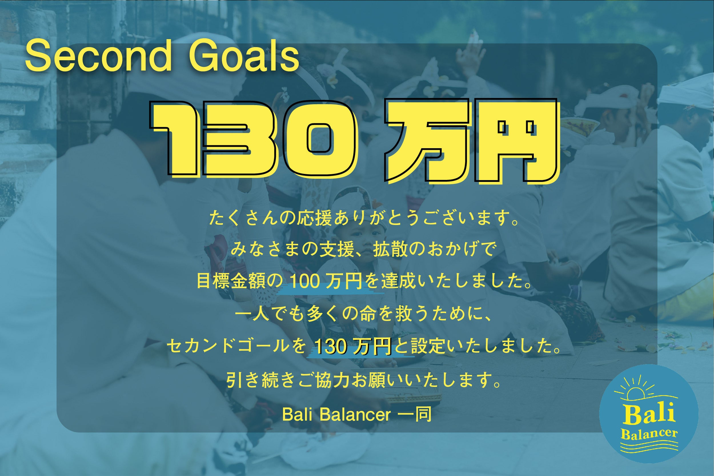 \更なる挑戦です/こんにちは!Bali Balancerのイツキです!皆さんの温かいご支援を頂き、目標金額を達成することができました!本当にありがとうございます!:::::::::::::::::::::::::::::::::::::::::::::::::::::::::::::::::2021/4/15 4:00現在支援者数:176名支援金額:1,204,017円終了まで残り2日と20時間:::::::::::::::::::::::::::::::::::::::::::::::::::::::::::::::::目標金額は達成しましたが、僕たちは引き続き、NEXTゴールに挑戦します!「バリ島で貧困に苦しむ方を助けたい」そんな想いが先走り、集められる見込みなど全くない中で始まった本プロジェクトでしたが、目標の100万円を達成することができました。正直、初めての挑戦で、本当に支援をしてくれる人がいるんだろうか?とドキドキしながらのスタートでしたが、結果は、僕たちの想像を遥かに超えるものでした。何よりも嬉しかったのは、皆さんから寄せられたメッセージでした。バリ島への熱い想い、あたたかい応援の言葉に、何度も目頭が熱くなりました。バリ島は、本当にたくさんの人から愛されているのだと実感しています。そこで、この輪をもっと大きくしていくことを目的の一つに加え、NEXTゴール(130万円)の達成を目指すことを決めました!コロナで観光がストップし、危機を迎えているバリ島で暮らす皆さんを、1人でも多くご支援するために、僕たちの挑戦に、もう少しお付き合いください。Bali Balancer 一同