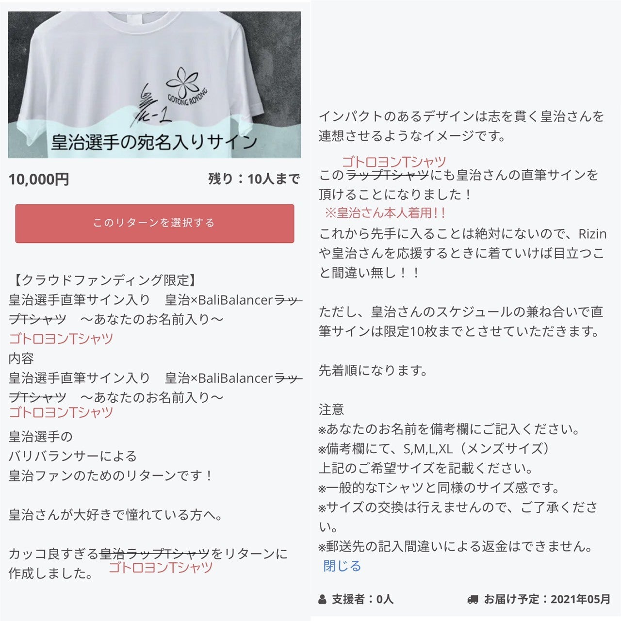 本日は追加した皇治選手のリターンに関して、訂正とお詫びがございますので、ご購入いただく際には必ずこちらをご覧ください。