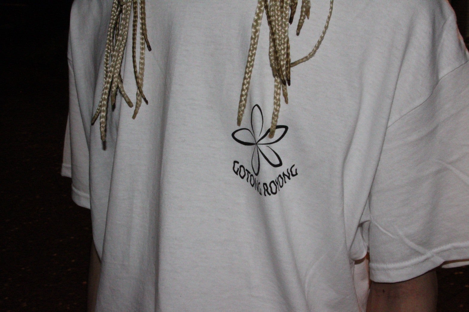 前面には、ゴトロヨン(相互扶助)の精神と、繋がりをイメージしたバリのプルメリアの花をプリント。