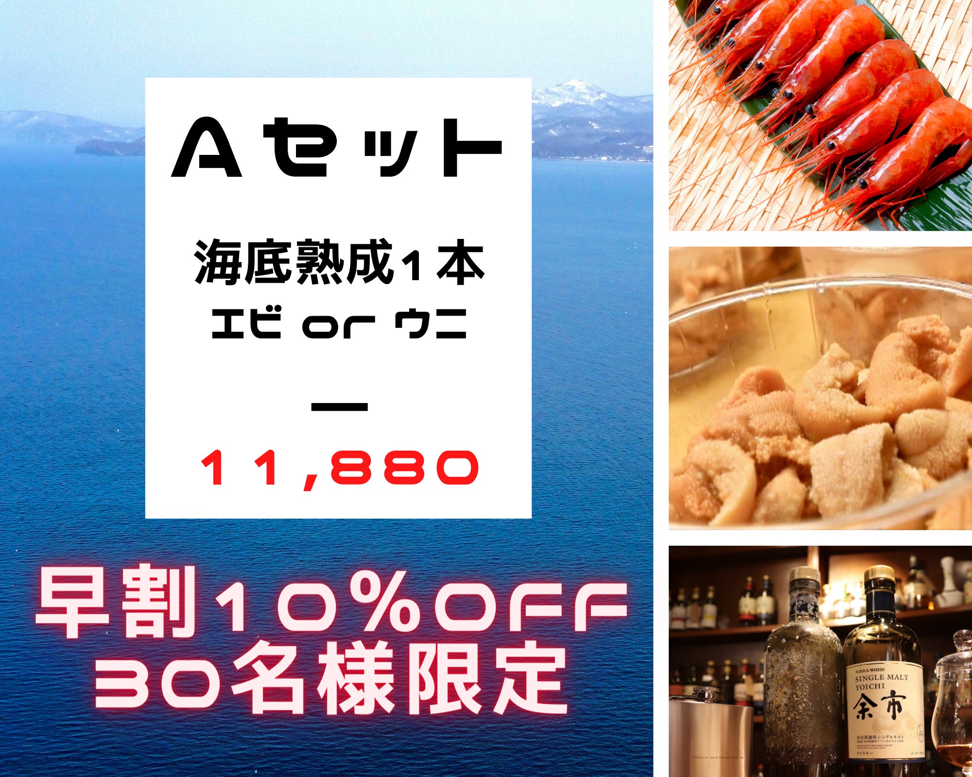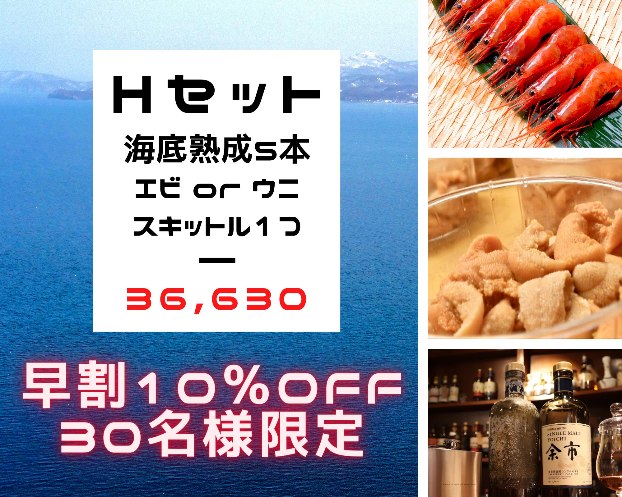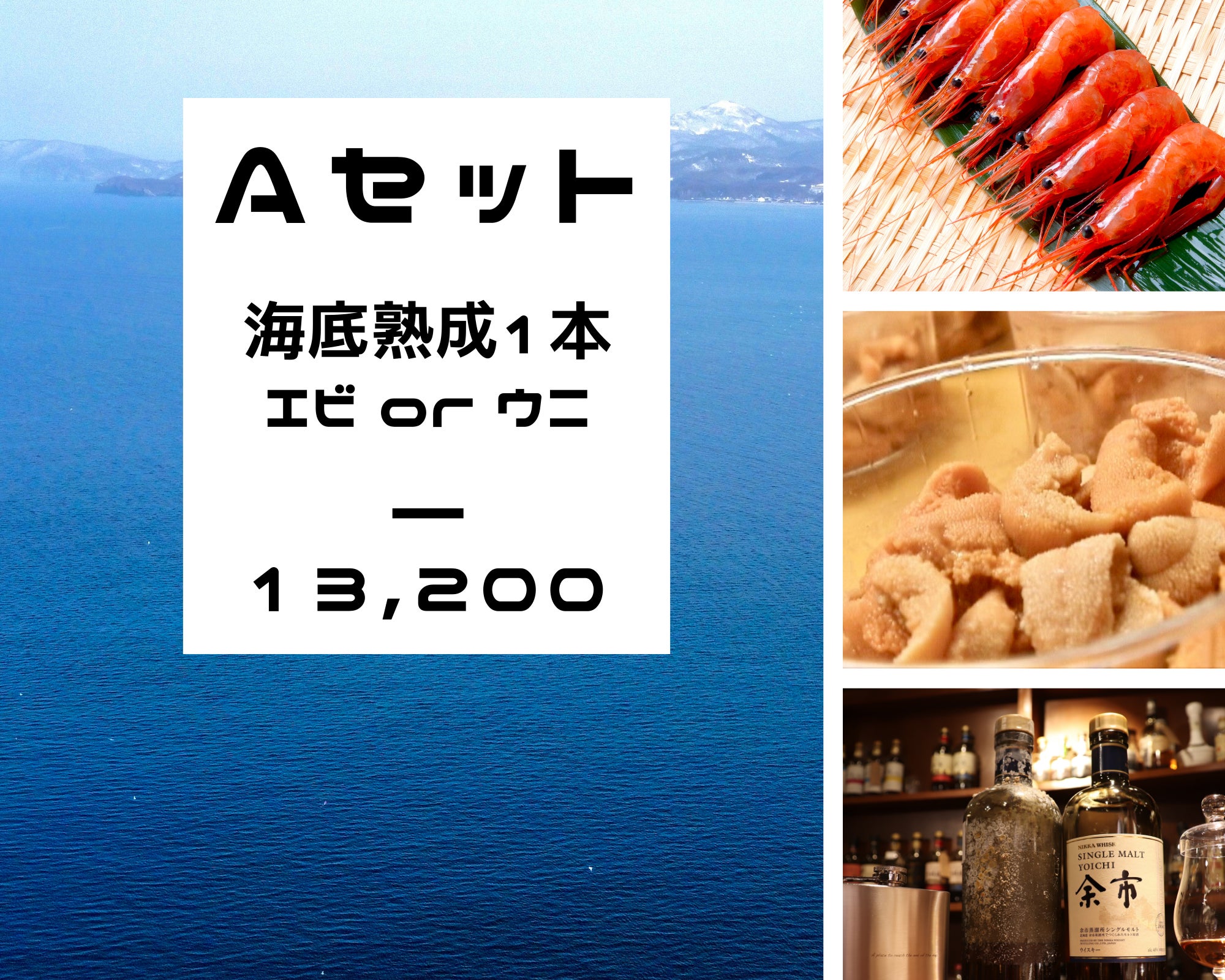 「お好みの酒類を海底熟成できる権利 × 5本」& ご選択オプション「余市産ナンバンエビ × 1kg約90尾」または「余市産 塩水キタムラサキウニ × 100g」