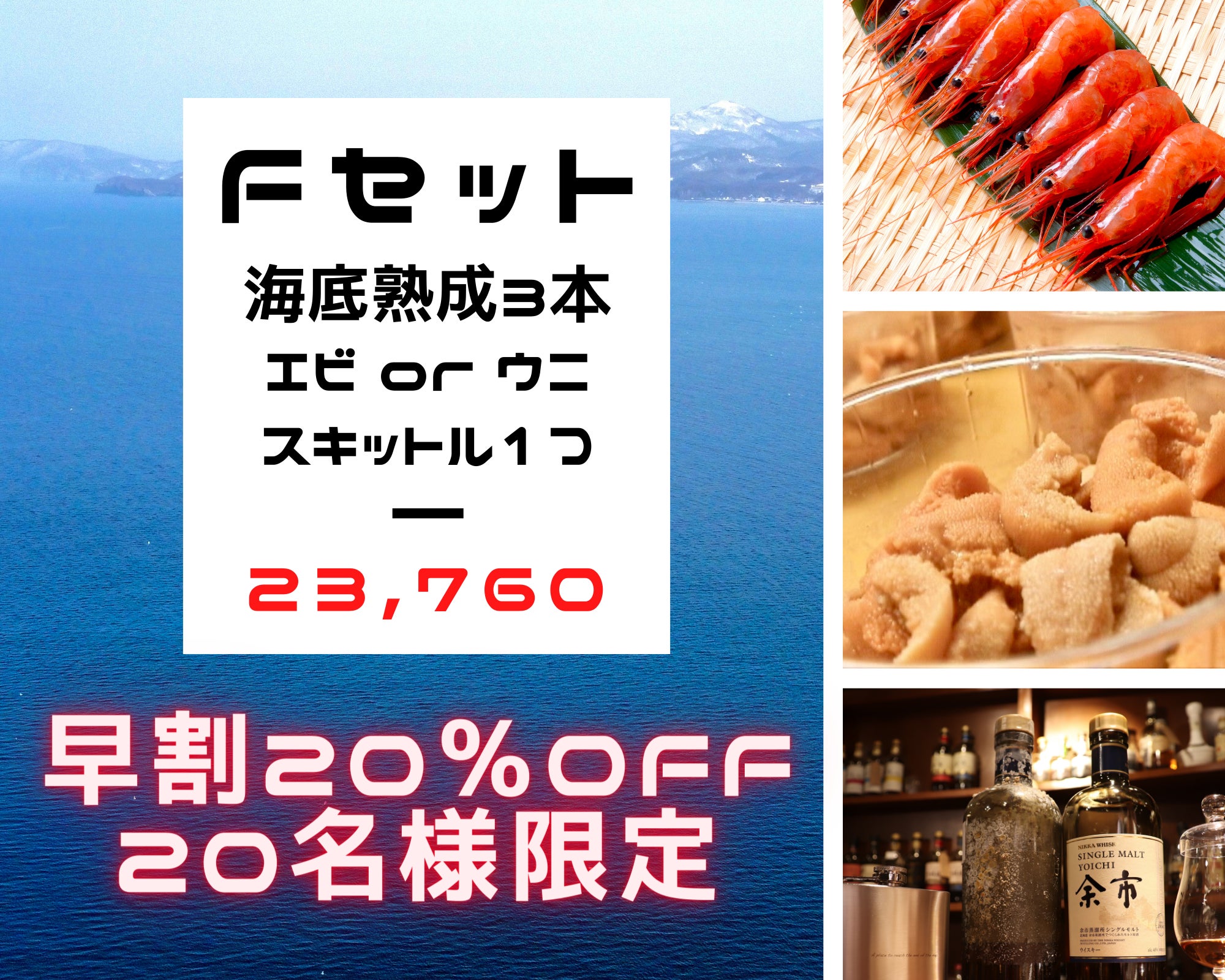 弊社では、100年以上前に沈没した船からサルベージされたウイスキーが、味を損なわれることなく美味しかったという説から、北海道のさまざま海域、海底でウイスキーやシャンパンなどいろいろなお酒を寝かせ、その海域の海産物とペアリングという新しい形の愉しみ方をご提案しております。