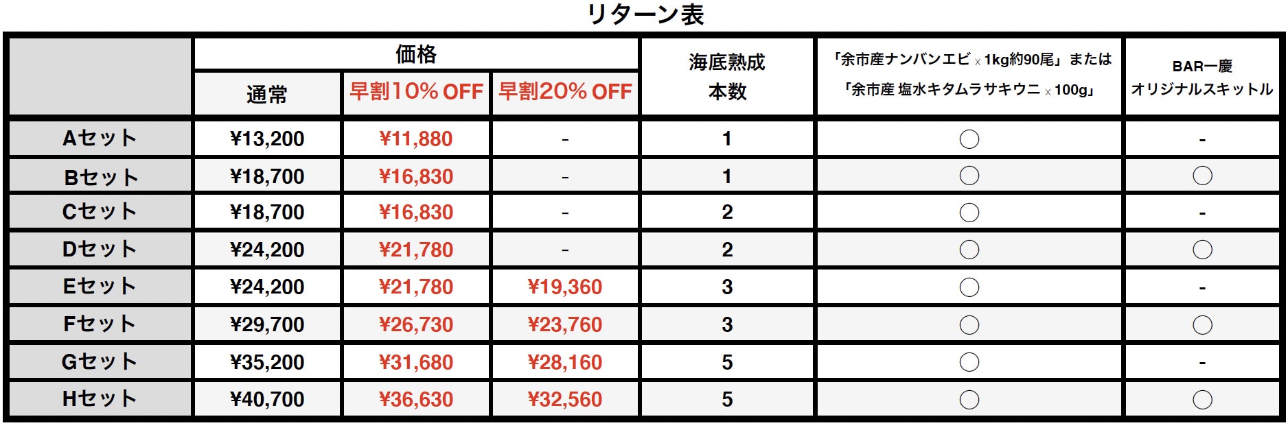 「お好みの酒類を海底熟成できる権利 × 5本」& ご選択オプション「余市産ナンバンエビ × 1kg約90尾」または「余市産 塩水キタムラサキウニ × 100g」 & 「BAR一慶オリジナルスキットル(6oz) × 1つ」