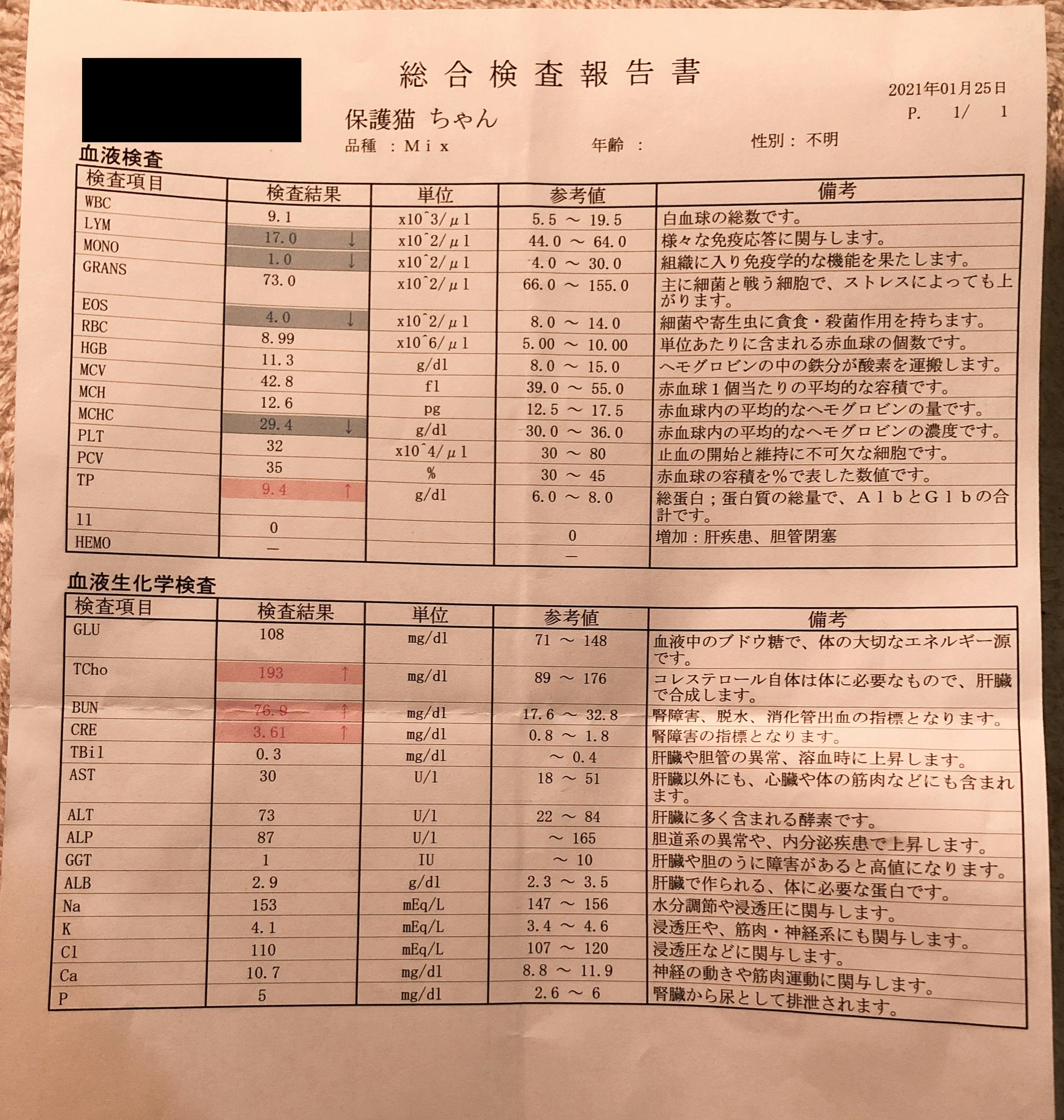慢性腎不全で数値が高いこと、また避妊手術やワクチン接種が必須であることから