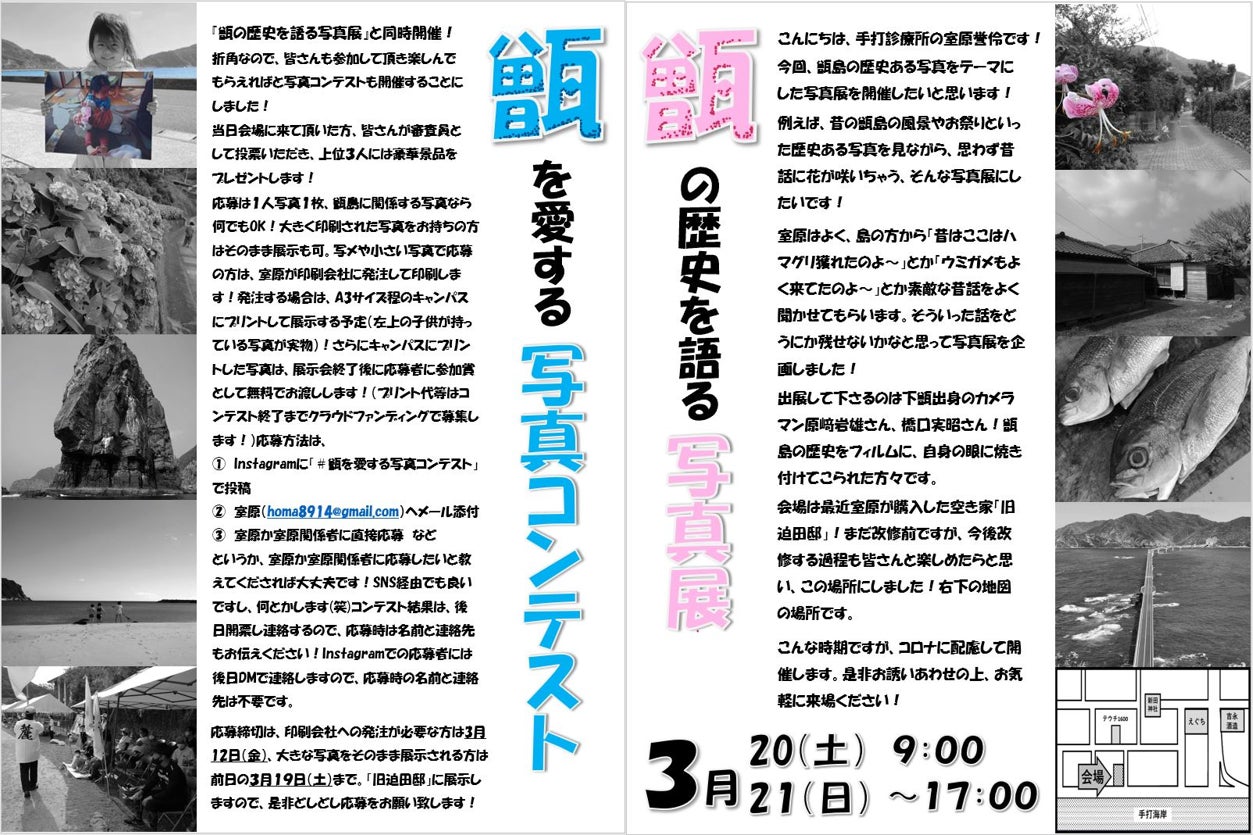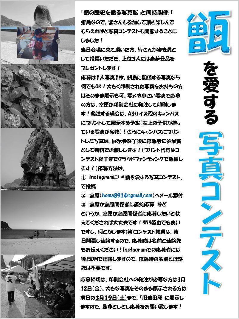 (↓が島内で貼ってもらっている写真展のチラシ!甑島に関わる写真を持っている方は是非応募下さい!)