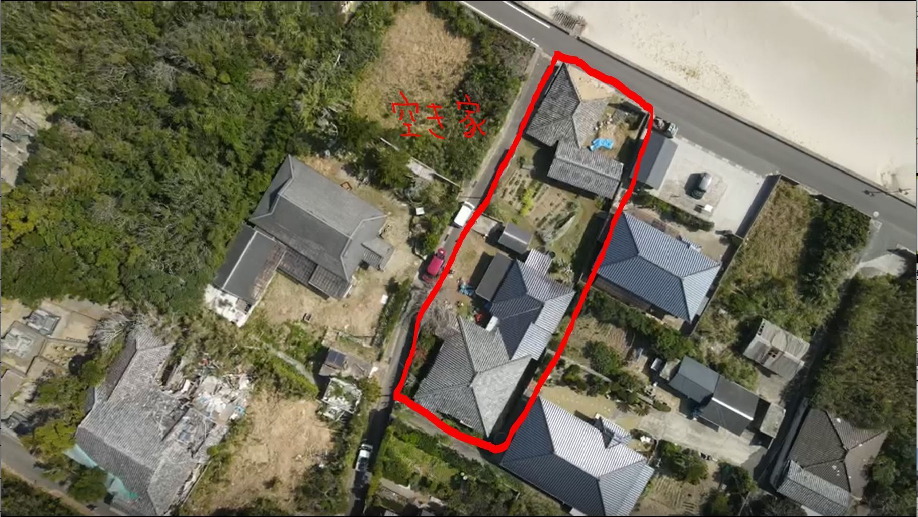 良い空き家が無いかな~と島の中を自転車こいで探し回りました。細い路地に入ってみたり、道に迷っちゃったり、休憩がてら浜辺で休んだり。そしてやっと素敵な家を見つけたんです!空き家になってから10年程経っているのでそれなりにボロボロなのですが、床下の梁は太くしっかりしていて、家の中には囲炉裏が2つ、なんと井戸まであるんです!他にも200坪の敷地に畑や物置に使ってた小屋が2棟もあるんです!