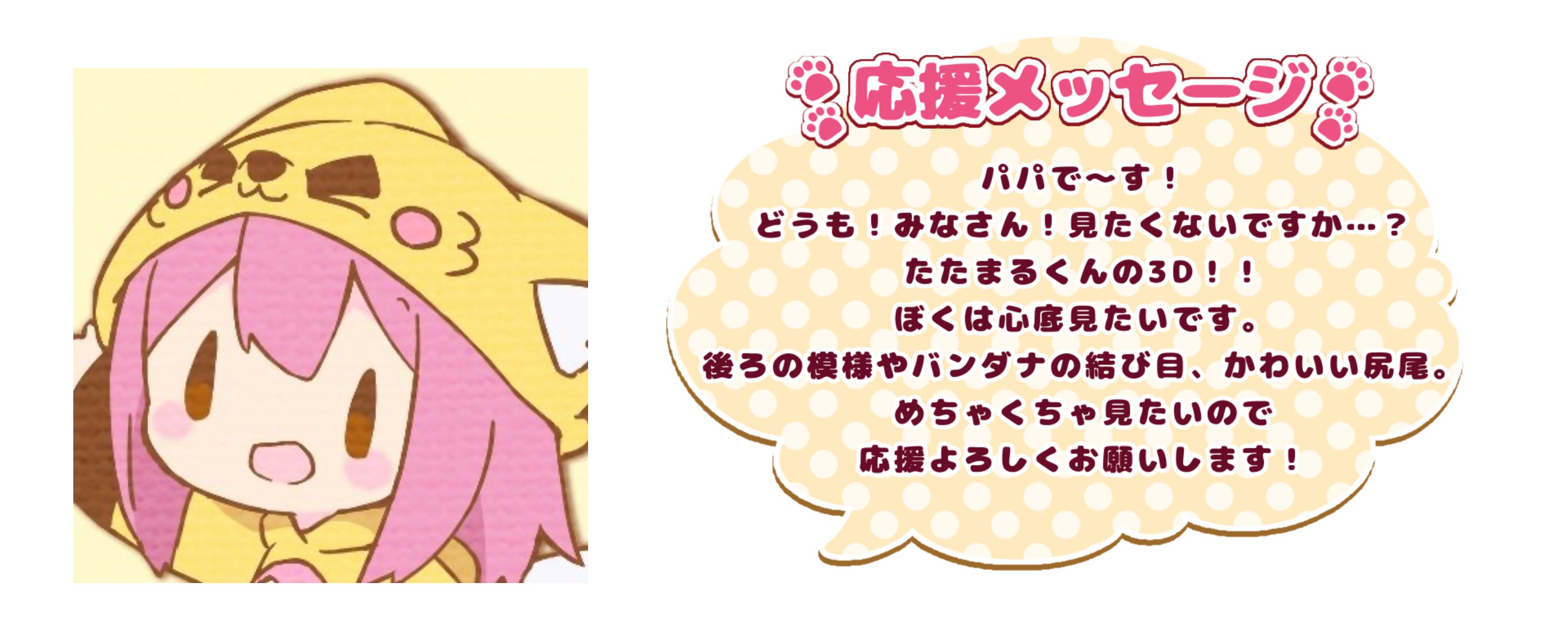 バーチャルYouTuberの子招き猫たたまると申します! もっと自由動き回りたい!2Dからもっと自由に…! 3Dになって可愛いくかっこよく動く姿をお披露目したい!! その姿でいつかは歌のライブも……? そんな思いからクラウドファンディングを決意しました。 応援していただけたら嬉しいです!
