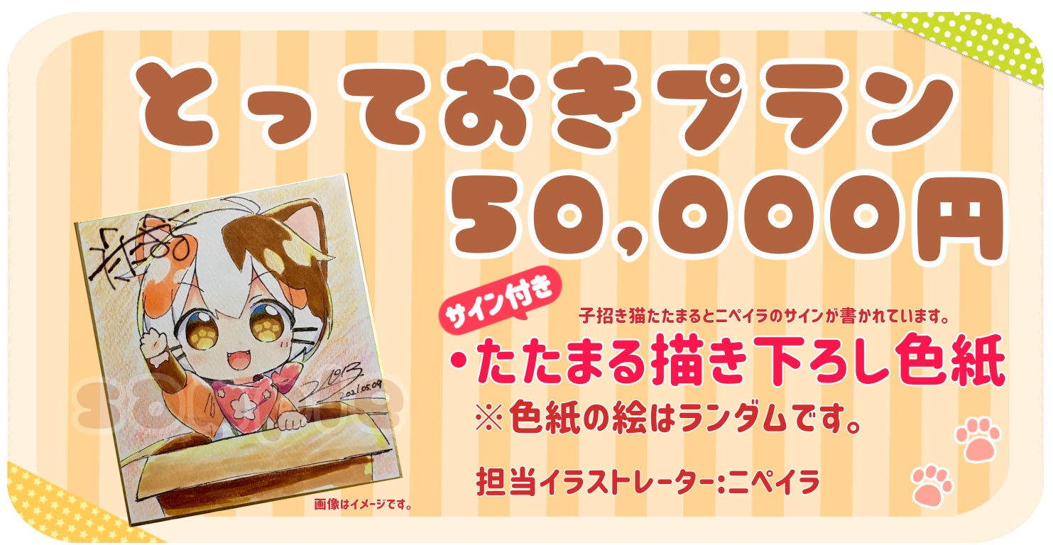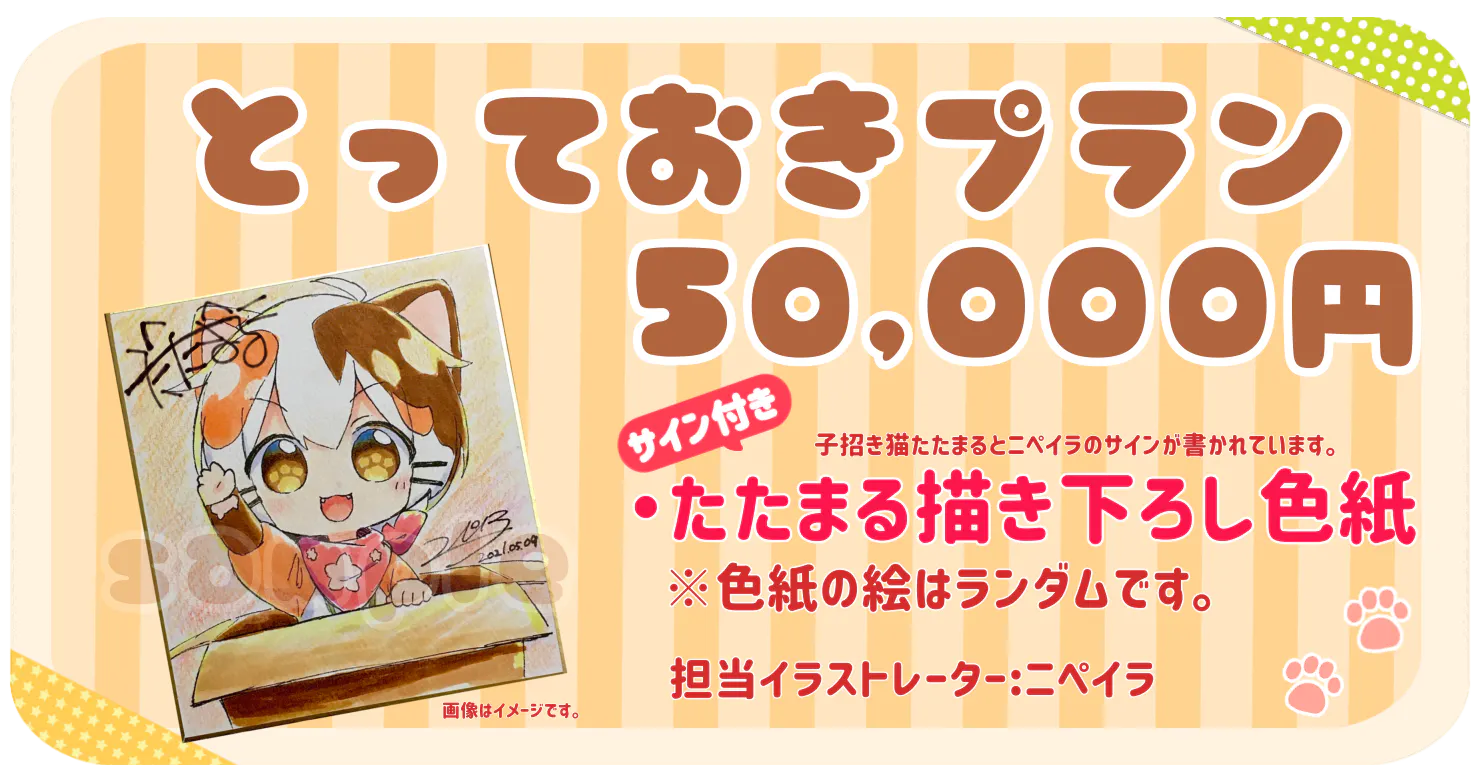 子招き猫たたまると二ぺイラのサインが書かれています。