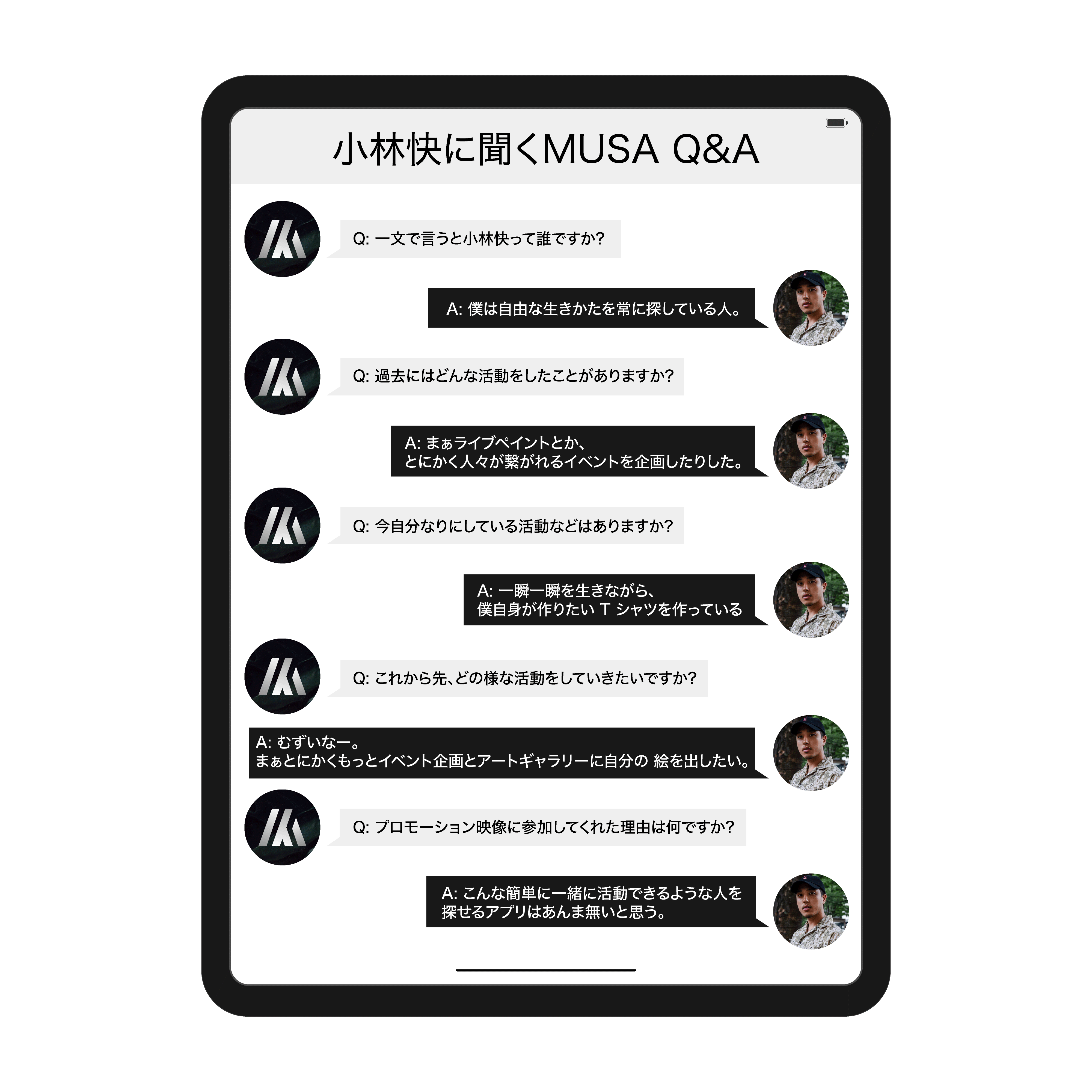 サービス名の由来は、ギリシャ神話におけるアートの女神です。このサービスが様々なジャンルで活躍しているアーティストの方々と全ての人々をマッチングすることからMUSAと名付けました。