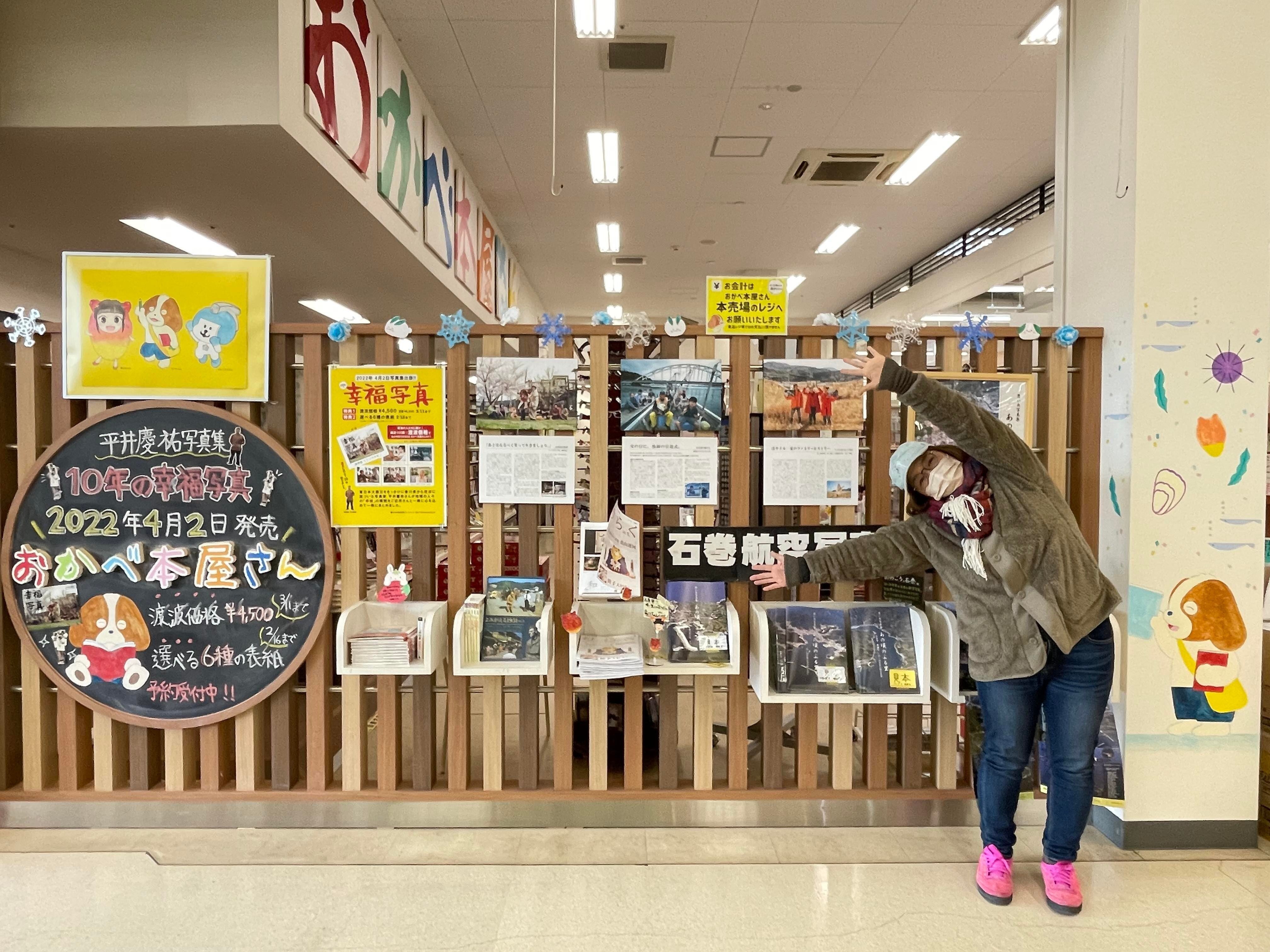 ばっちり設置完了です。実は、いつもいつもお世話になっているイオンスーパーセンター石巻東店(渡波イオン)内にある「おかべ本屋」さんにて、ミニ写真展がはじまってます〜〜♪こんなふうにジャジャン!!逆からもじゃじゃん!まだ制作途中の写真集ではありますが、その中から選りすぐりの3枚の写真をピックアップして一足早く展示させてもらっています。じっくり読んでもらいたいなぁと思って、実際に写真集の中に入る文章も全部読めるようにもなっています。やっぱり地元渡波ってことで写真集に写ってくれている人も多いので、おかべ本屋さんのスタッフさんもさっそく「知り合いのおばちゃん写ってましたー!」と嬉しそうに声をかけてくれました。会期は4月7日(木)までのロングランとなっています。途中で違う写真に張り替えたりもしようと思ってますので、お買い物の際にぜひ見てみてくださいね!■ミニ写真展「10年の幸福写真」@おかべ本屋さん会期:2月7日(月)~4月7日(木) 9:00~21:00 入場無料場所:おかべ本屋さん(イオンスーパーセンター石巻東店正面入り口付近)石巻市流留七勺1-1地図:https://goo.gl/maps/LpQYENXV64MBzfay8問い合わせ:おかべ本屋さん 0225(24)3539さらに!!地元渡波の本屋さんということで、特典としておかべ本屋さん限定で渡波価格¥4,500(定価¥4,950)にて先行予約を申し込むことができます!!是非とも渡波のみなさんに届いて欲しいなぁと思っていますので、こちらもどうぞよろしくお願いします!!