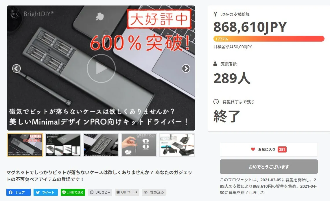 このプロジェクトは、2021/03/05に募集を開始し、 289人の支援により 868,610円の資金を集め、 2021/04/30に募集を終了しました
