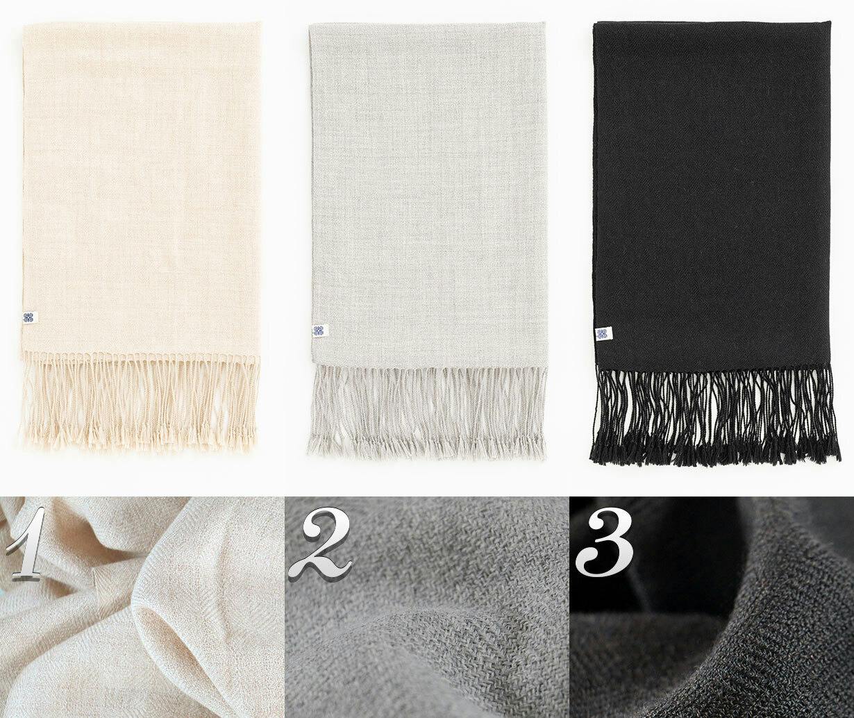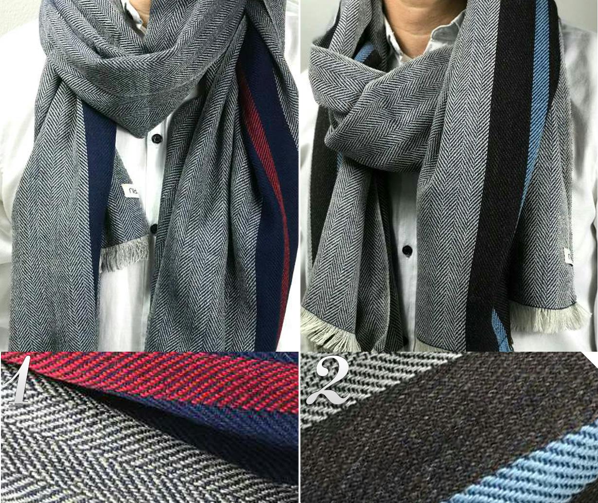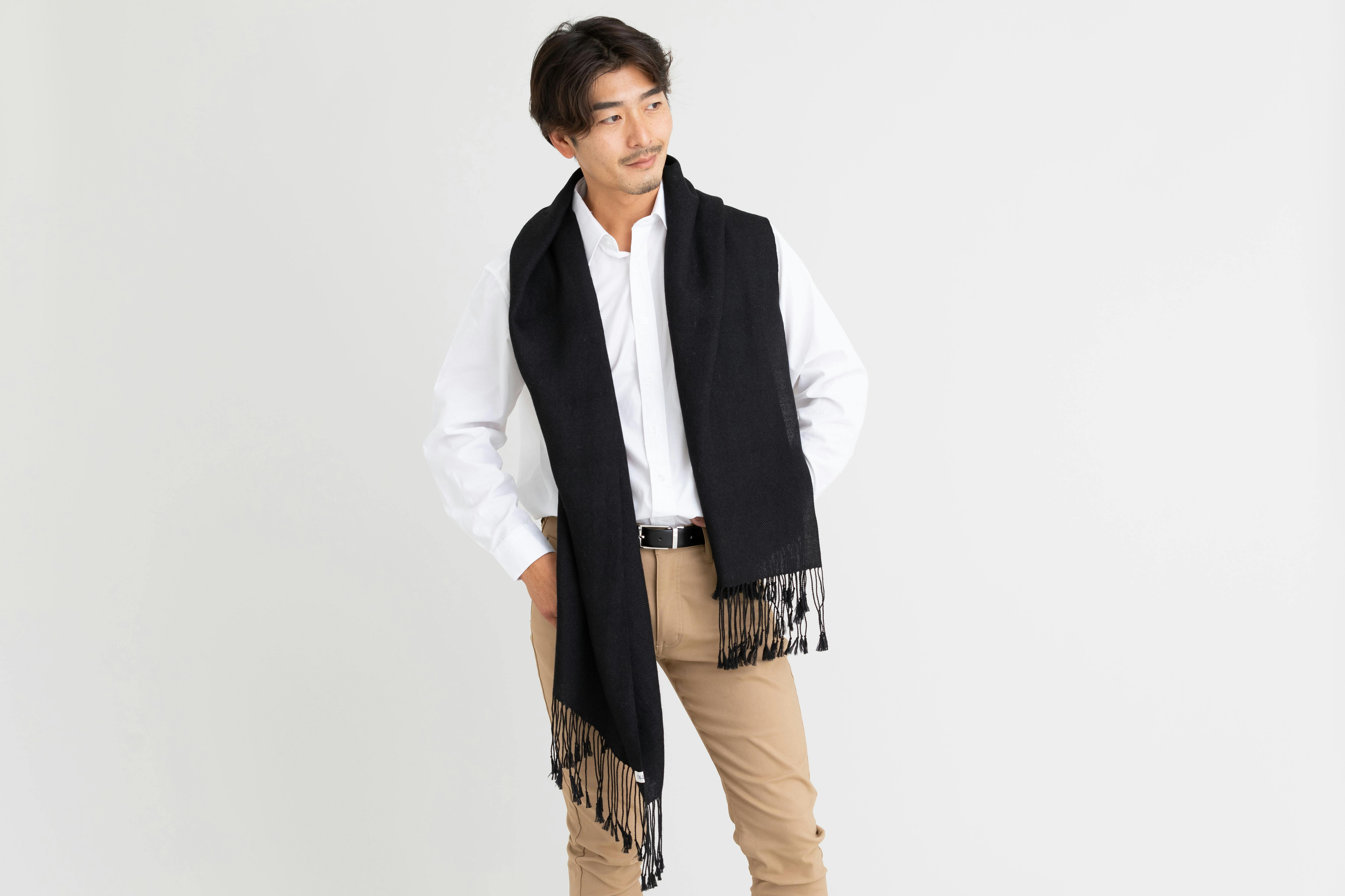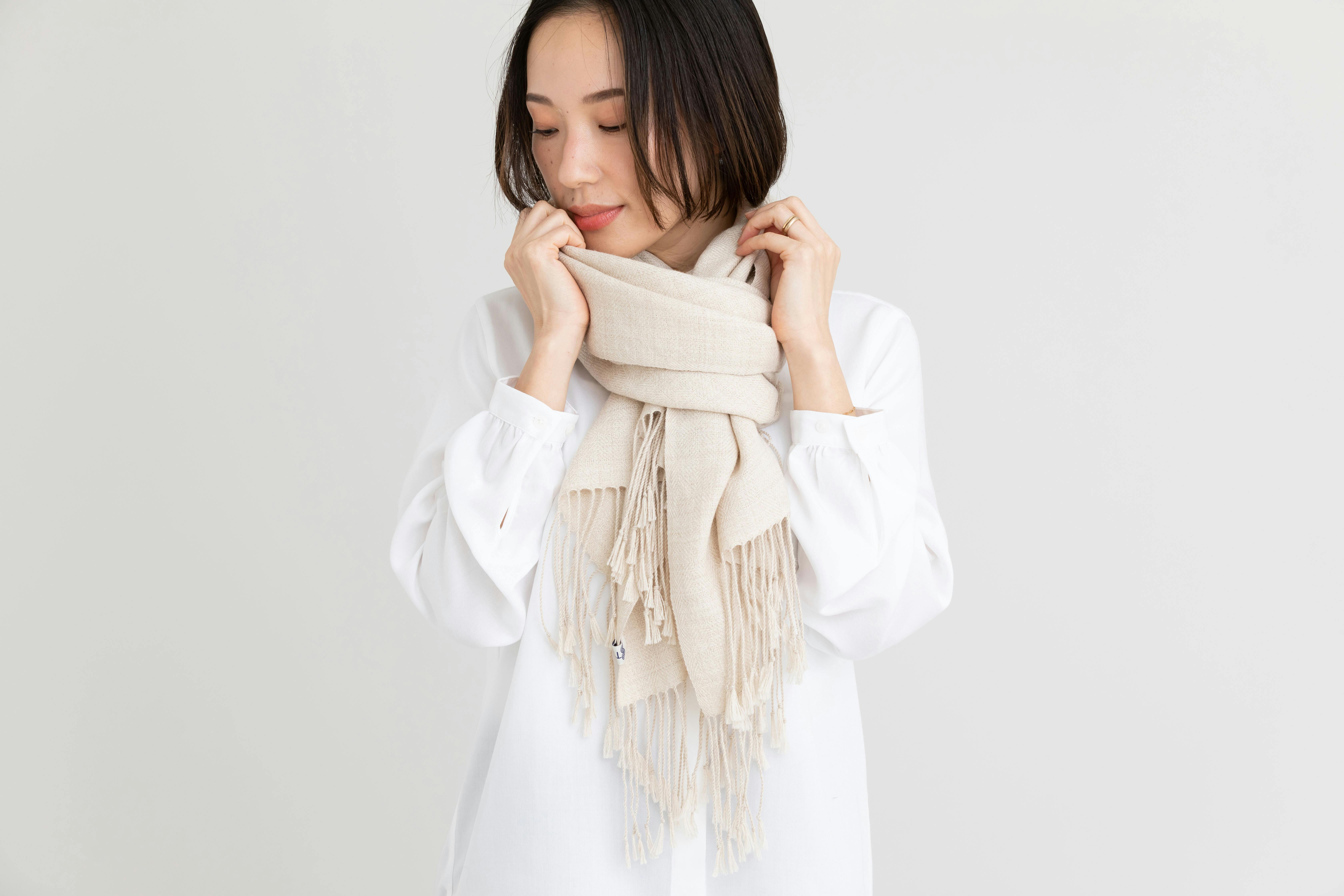 大判のストールは首に巻く事は勿論、肩から羽織ったり、膝に掛けたりとても便利。