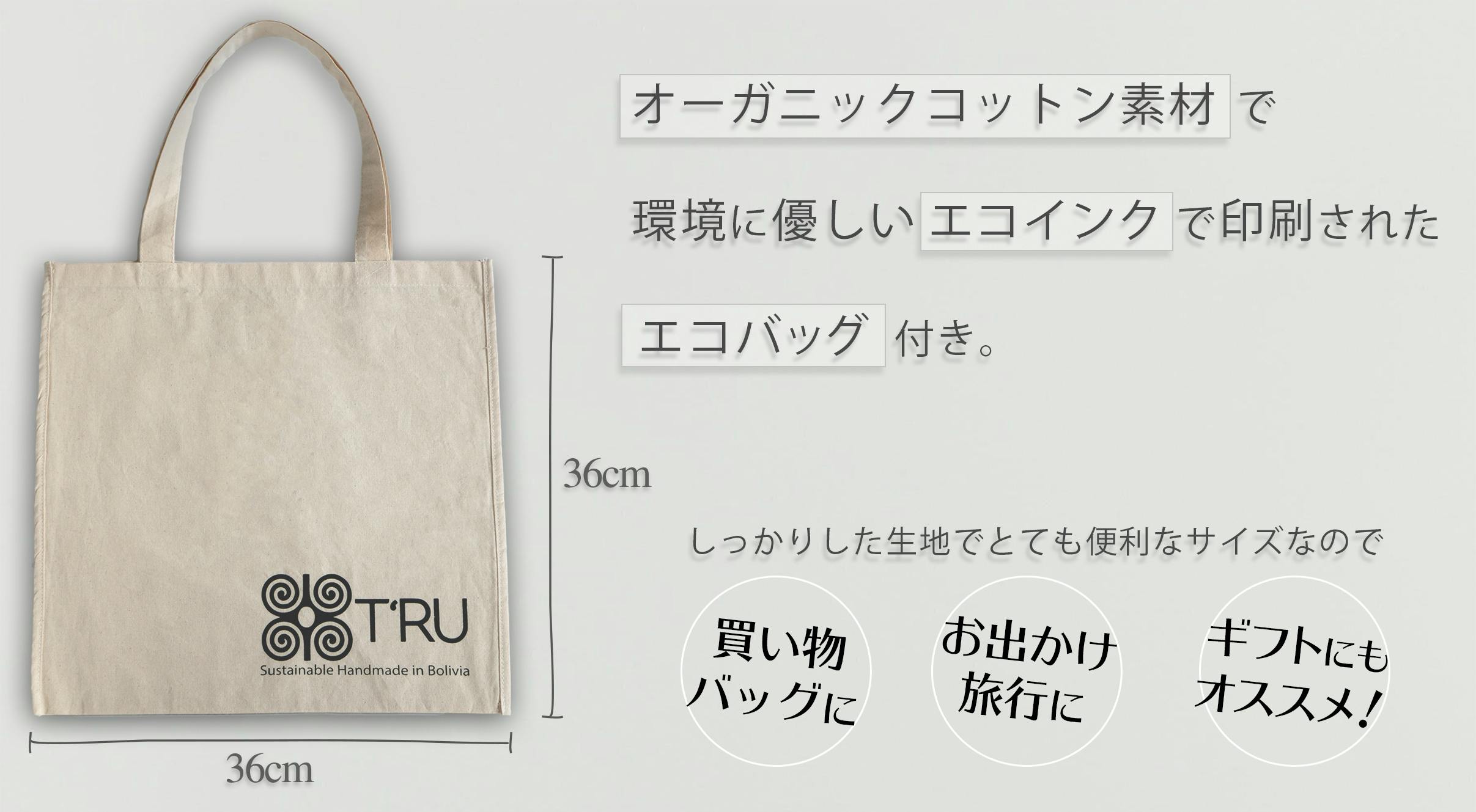 このバッグもボリビアで生産され、素材もオーガニックコットンで環境にダメージを与えない特別なエコインクで印刷されています。